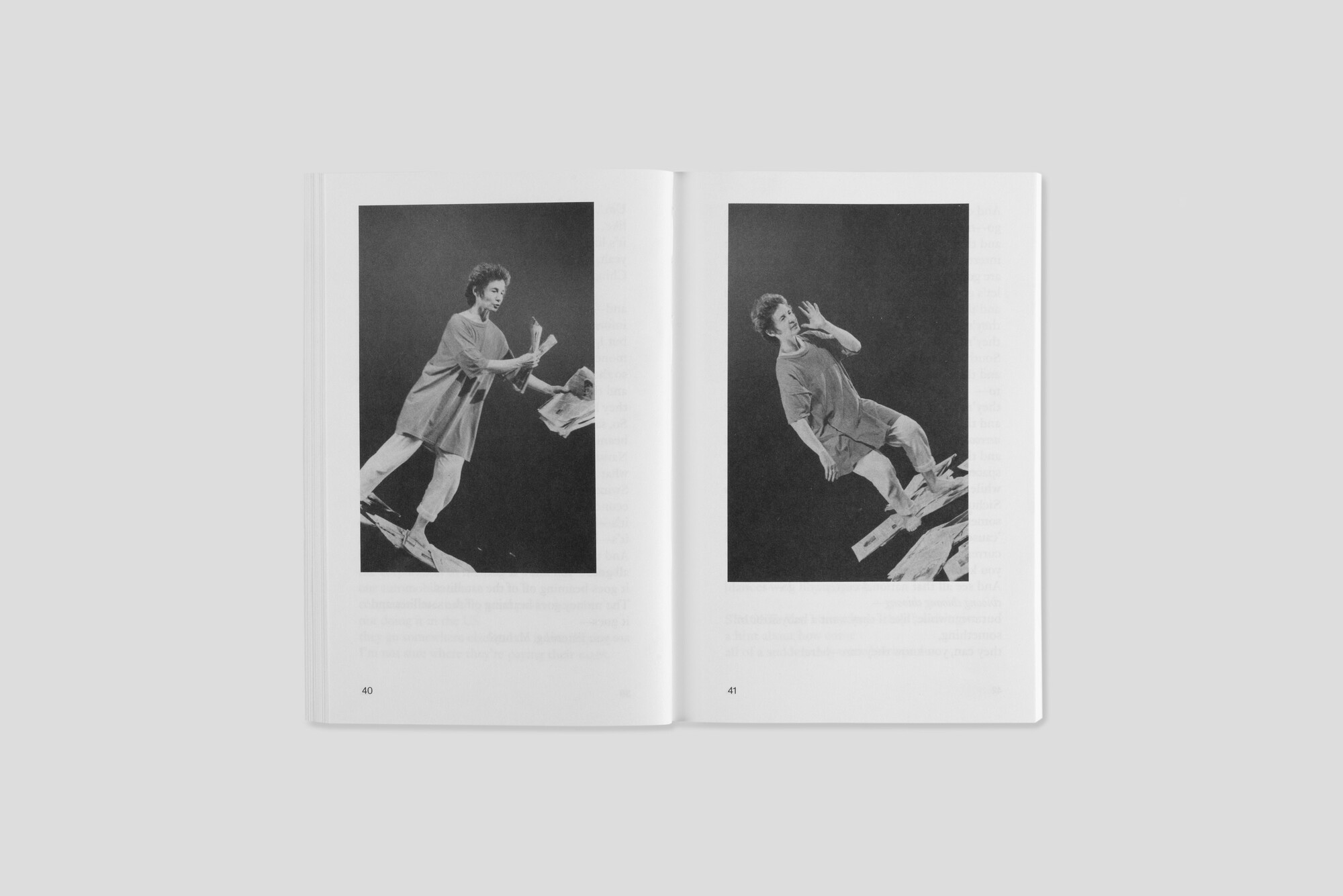 This book, published to accompany an exhibition at the Centro per l’arte contemporanea Luigi Pecci in Tuscany, gathers together preparatory drawings, transcripts, and photographs from performances around the world. There is something unavoidably self-defeating in this exercise, which binds into a book a series of improvisations designed expressly to enliven printed material. Divorced from Forti’s physical responses to the words and images she is encountering, the transcript of her speech can read like a Dadaist monologue: “… and it was so abstract and like the Bhagavad Gita, reading about those battles and reading about Rome and the Tower of Babel and…”