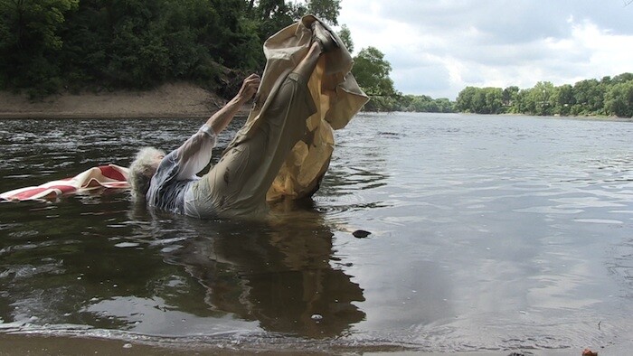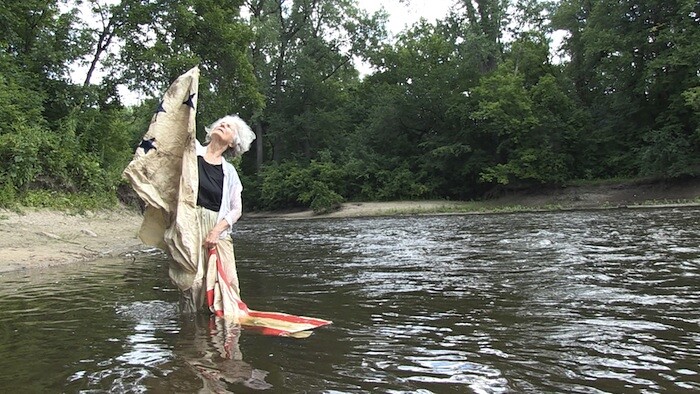 Your performances are the jump and splash of a brook, the color of a found leaf, a painted flag wrapping a woman as the river dances around her. At 80, your nimble movements inspire. When I stop to read back about your lifetime of accomplishments and confluences, I can’t help but admire you all the more: learning improvisation with Anna Halprin in San Francisco in the 1950s; trying and moving into your own through the techniques of Merce Cunningham, Martha Graham, and Trisha Brown; your presence at the birth of Judson Church; your collaborations with Yoko Ono, La Monte Young, and Terry Riley. Just a few flickers from an enduring and illustrious career. I see all those layers and life here in your videos, objects, performances, deepening the grace of your movements and the susurrus of your words, knowing that such simplicity is not easily won.