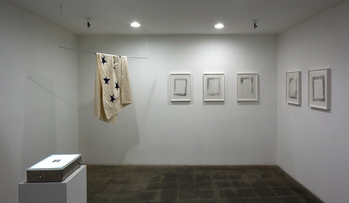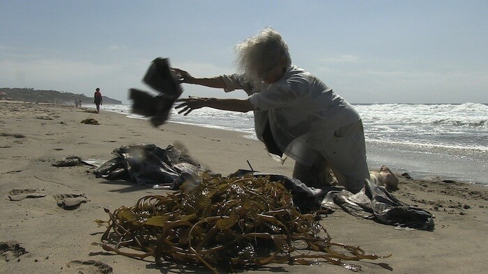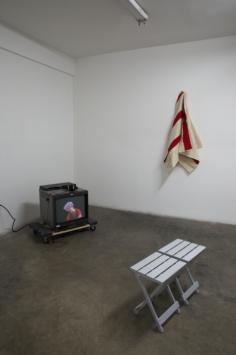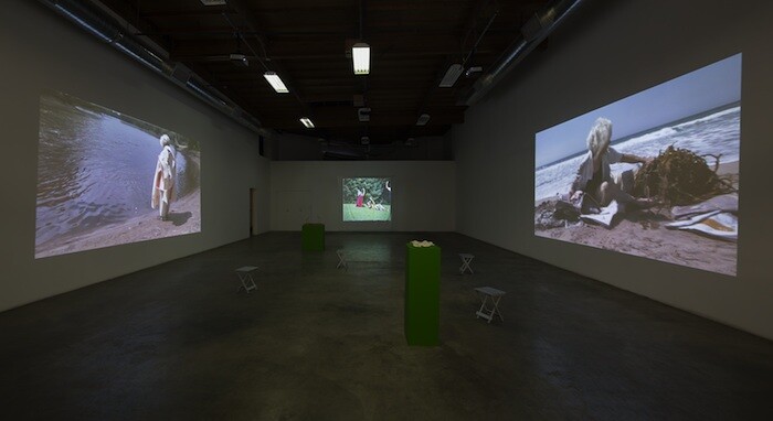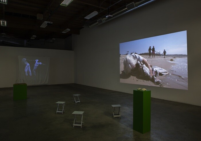 In the long, high gallery at The Box, I watched the water crash and shiver over the stones on the monitor in Northeast Kingdom (2015), the headphones sounding a dinner conversation between two men about geography and Vermont. Plucking the headphones off (always like wearing an insect when looking at art), I turned to look at the trio of projections behind me. In Flag in the Water (2015) I couldn’t feel the difference between the sound of the flowing water and your movements through it as you stepped into the river in your white shirt and khaki pants, wearing the flag like a shroud, a wedding dress, a shield. Opposite the river is the ocean. You wrestle and rest with a sheaf of soaking newspapers and a tangle of seaweed in Zuma News (2014). I liked seeing the spooked viewers trying to jump out of the eye of the camera along the river, bemusedly passing a glance upon the beach, caught as witnesses in these cleansing ceremonies. I liked them because I felt like them. Not for a moment unwelcome, there’s a softness, a kindness in your performances, but even then I felt a gravitas to all this, a simple ritual with a flow that I wouldn’t want to ungracefully mess up.