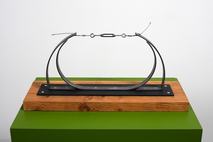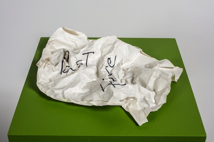 And here, for me, that is what your exhibition is about: flow. The flow of water, of human events writ large, of time, of pure movement. Though most of the work dates from the past couple of years, there are a few things from the 1960s, and documents from the ’80s into the 2000s, that reveal a stream through the decades. The painting Sink (1960) lets water out. A sculpture of dynamic tension (entitled A Sculpture, it was dreamed in 1961 but made only this year) and a crumpled paper scrawled with the words “Past” and “Future” (Past/Future, 2012) both examine the tension of the present in time. The latter two rested on plinths painted a shade of green that your recent collaborator Jason Underhill told me was intended to match a leaf found outside the gallery.
