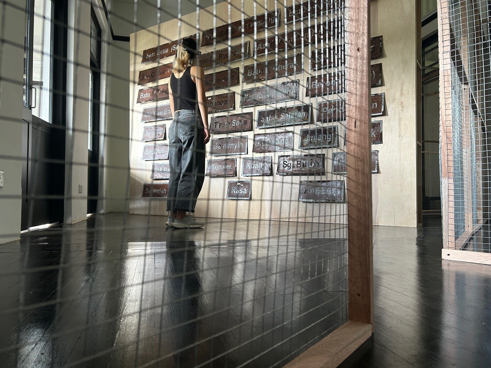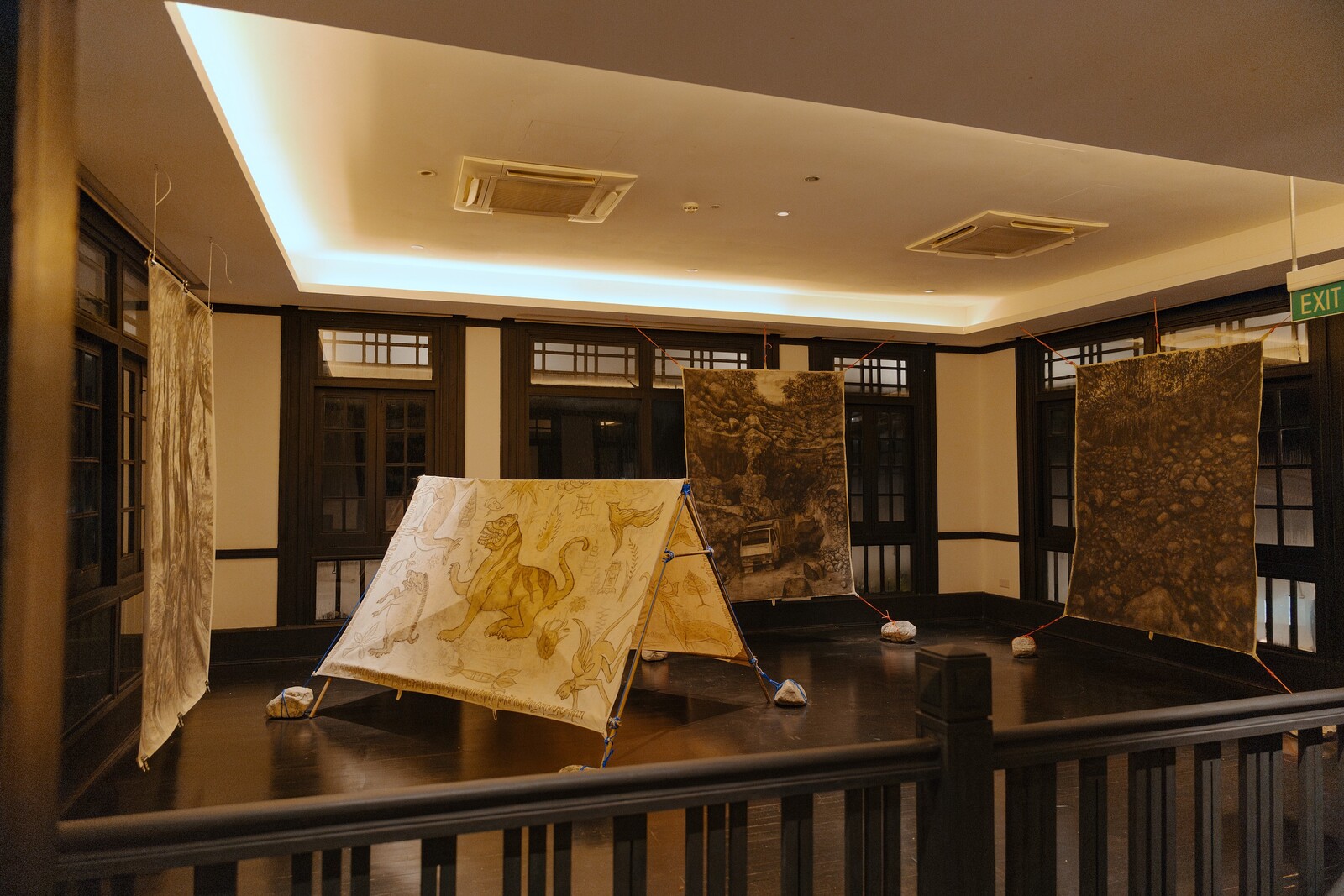 Another thematic thread in SAW was the excavation of Singapore’s regional histories. “The Eye and the Tiger”, which took the form of a guided tour in and around a black-and-white bungalow in Adam Park, explored the colonial legacy in Southeast Asia of racialized policies and resource extraction. Highlights included Maryanto’s charcoal drawings of the sand-mining operations around Mount Merapi, an active volcano, in Indonesia. These vertical canvases, suspended from the ceiling, depict a cross-section of the earth, so that our view is dominated by a wall of soil and rock that has been violently gouged and exposed. Exploring a different kind of violence is Chong Kim Chiew’s installation Isolation House (2005), which references the “New Villages” set up by the British to house Malayan Chinese suspected of supporting communism from 1948 to 1960. Inspired by these glorified internment camps surrounded by barbed wire, watchtowers, and armed guards, Chong created a cage-like installation that starts indoors and extends outdoors into a cage in the sun, viscerally evoking the dehumanizing experience of refugee camps, detention centers, and prisons.