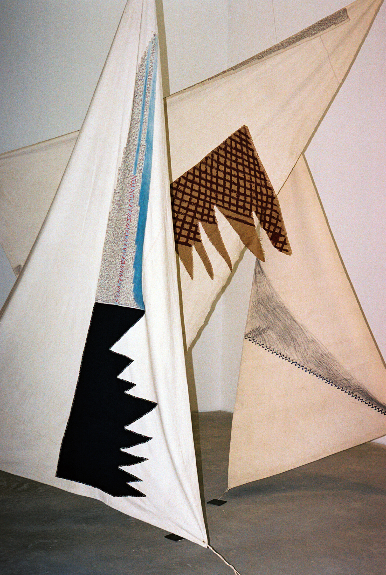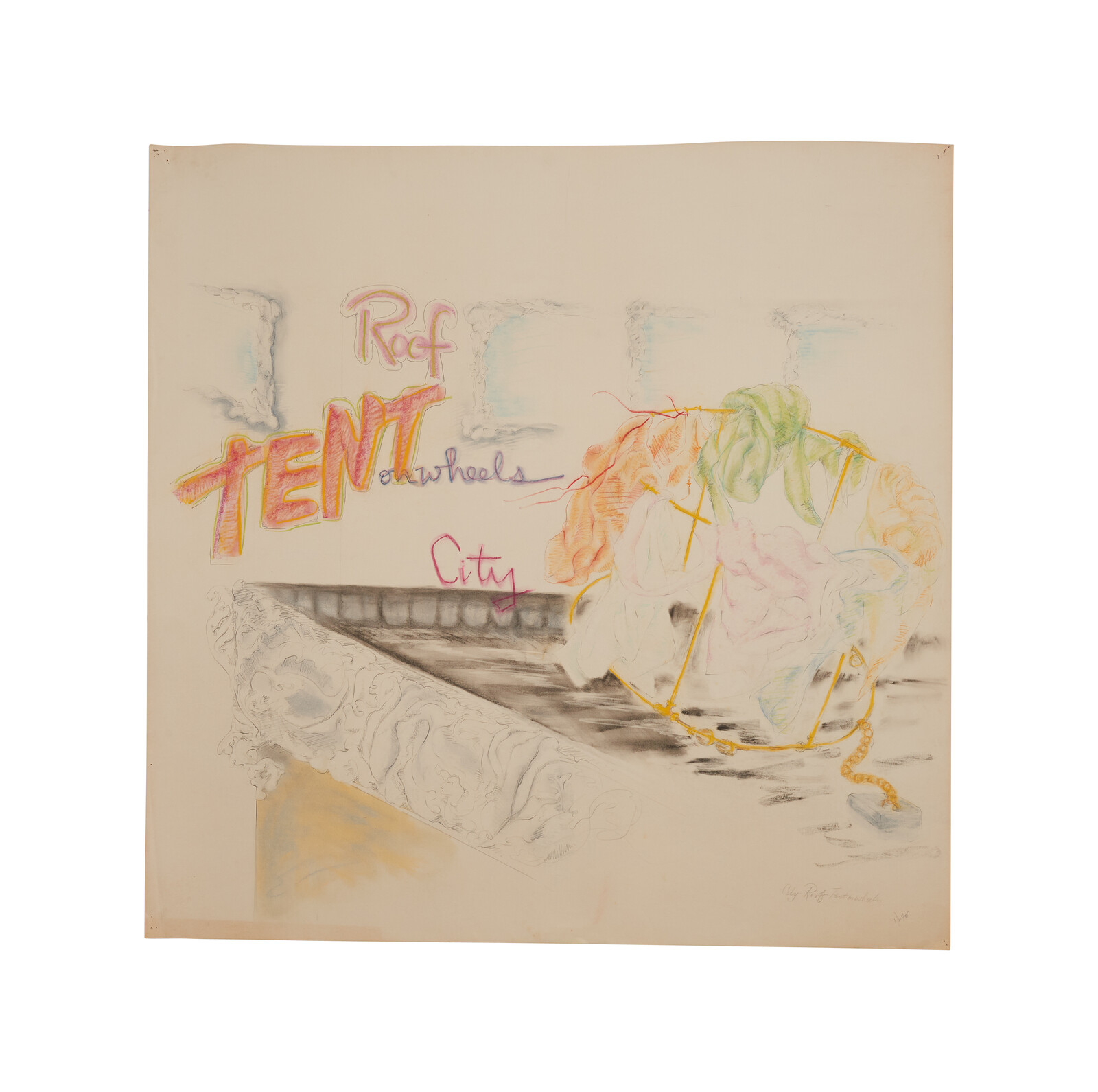 The use of banal materials was also a key motif of late-twentieth-century feminist art. In Senga Nengudi’s RSVP Reverie–Combat Fatigue (1977–2011), a sculptural installation of knotted, stuffed pantyhose, she pays homage to gendered and racialized “used bodies” that persevere through processes like childbirth, nursing, and mothering. Likewise, artist sisters Rosemary and Bernadette Mayer address the rituals of everyday life. Bernadette’s diaristic poems (from the 1970s through 1990s) muse on human-animal and intergenerational relations. Drawings by Rosemary (who died in 2014) expound on her study of ancient myths—a guiding factor in her 1970s sculptural works with draped fabric, as well as her ephemeral performances of the later 1970s and early ’80s known as “temporary monuments.” Several playful sketches plan out her Moon Tent ritual, staged at the home of art historian Robert Hobbs in upstate New York on a full moon in October, 1982, during which she wrapped the beams of Hobbs’s rooftop pavilion in gauzy glassine paper and staged an all-night party.