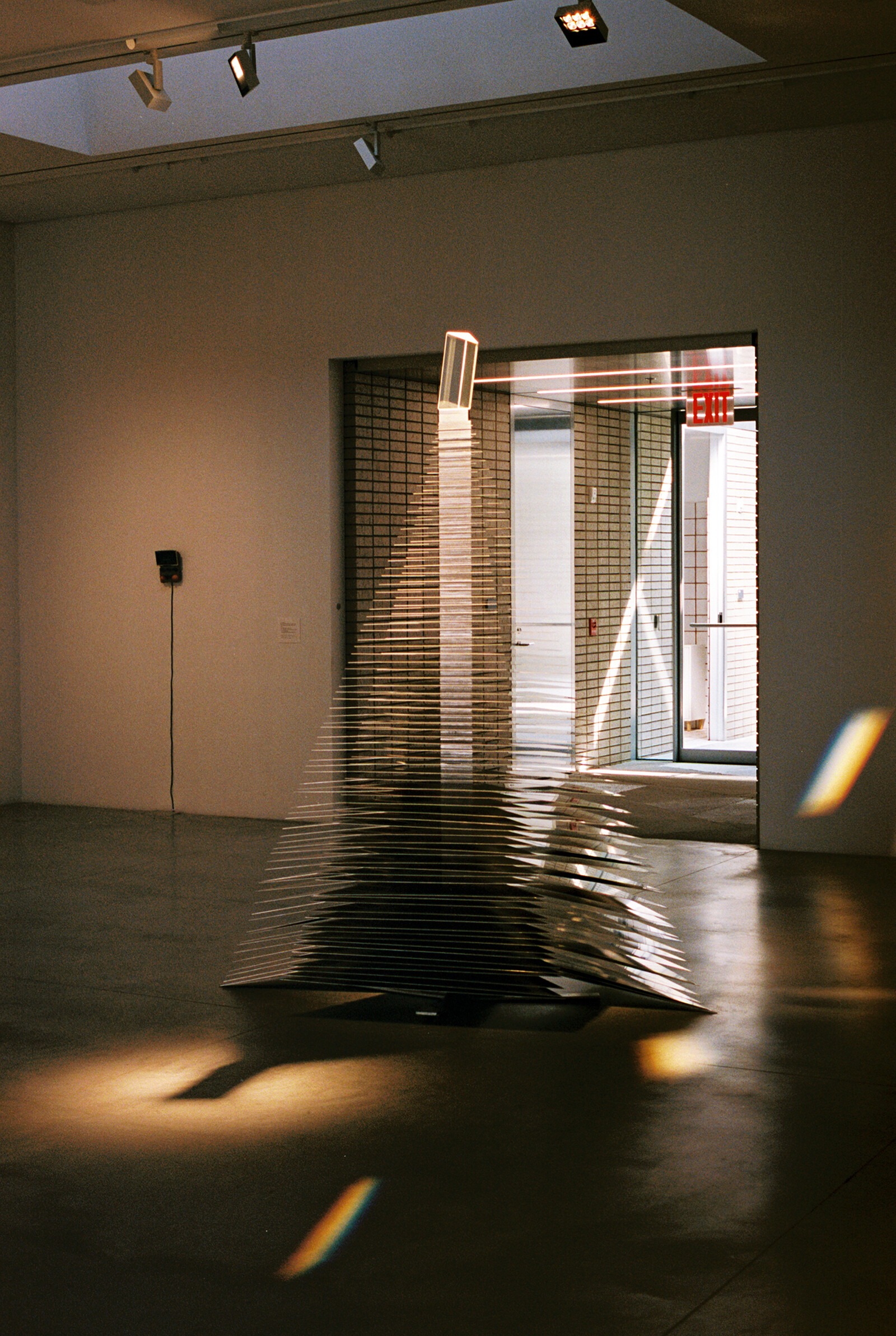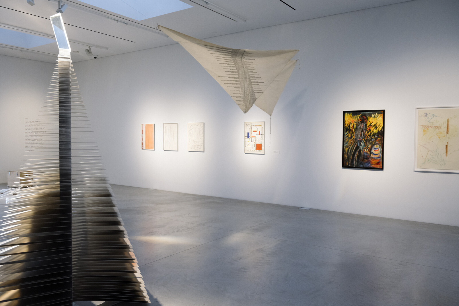 The exhibition draws significant attention to artists rarely shown in the United States: Bia Davou and Liliane Lijn. The late Greek artist Davou’s drawings recall the works of German Conceptualist Hanne Darboven, known for her compositions of inscrutable number combinations. Davou’s practice, however, melds abstraction with politicized concerns and emerging technology. Lijn, an American-born artist based in London, has worked in kinetic sculpture since the 1960s. She shows several “Woman of War” drawings from the 1980s (preparatory sketches for a monumental, moving public sculpture) and the metal installation Queen of Hearts, Queen of Diamonds (1980). This pyramid-shaped sculpture is made from thin, triangular sheets of stacked aluminum, topped with an optical glass prism. The effect is much like a massive house of cards that acts upon a set of inversions. Physically heavy, the slim metal panes appear nearly nonexistent from certain angles. Built from monochromatic, industrial materials, its prism throws pools of rainbow-colored light around the room. Completely static, it is activated through movement.
