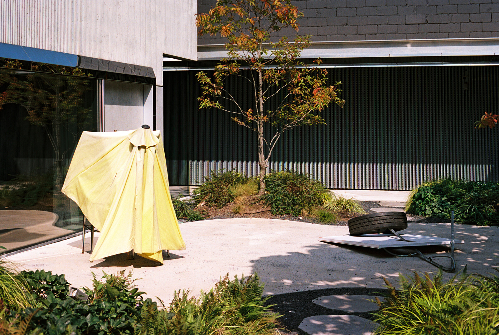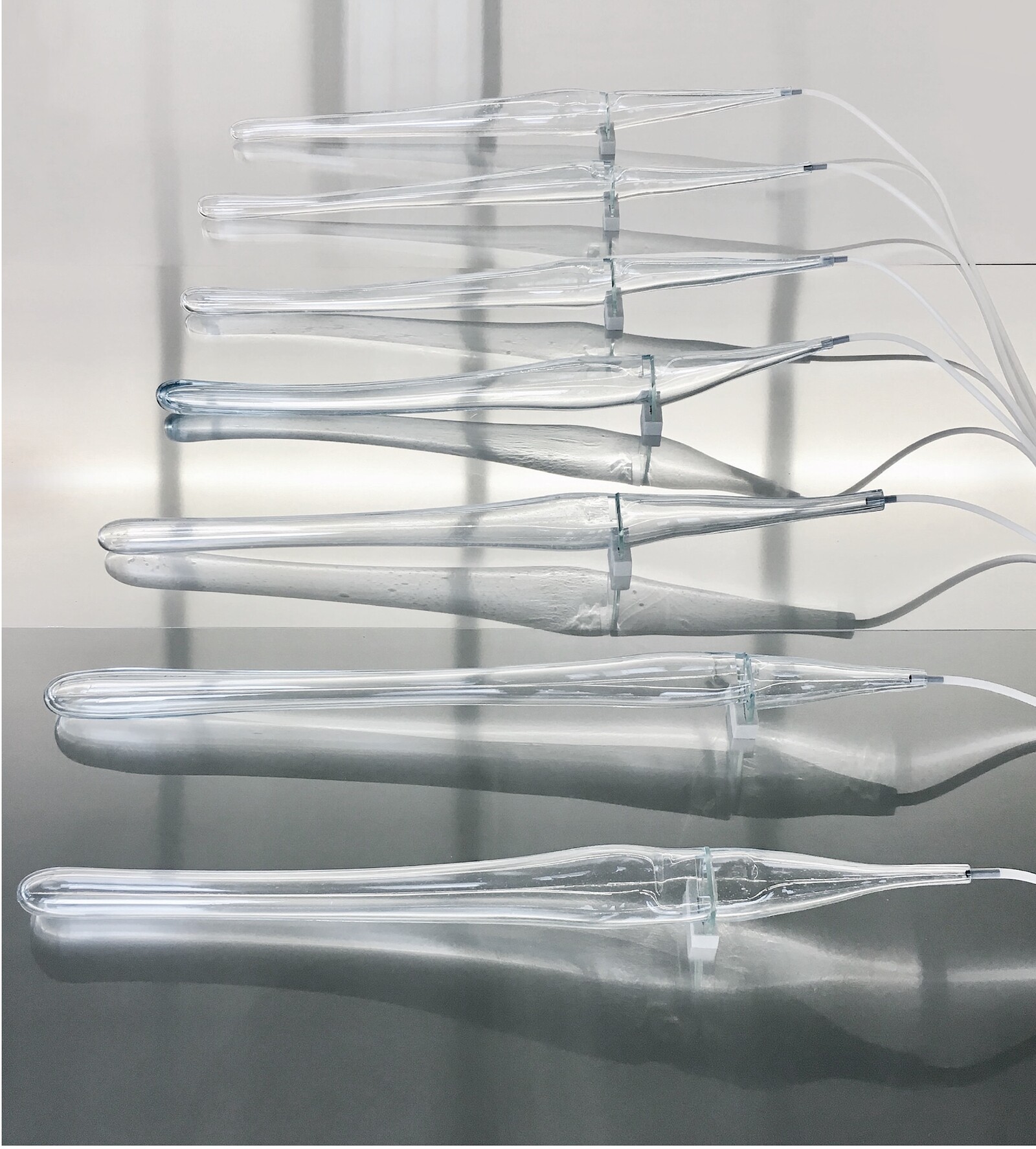 In the space opposite the courtyard, Katja Aufleger’s glass sculpture Sirens (Al Wakra Vol. III) (2019) emits warm, ambient tones. This set of seven organically shaped glass vessels, sonically activated by an air hose, were made from sand from a Qatari desert known for its singing dunes. At times it is virtually impossible to distinguish the sculpture’s sounds from the wails of emergency vehicles outside, or the alternations between speech and siren-like music in Aura Satz’s video Preemptive Listening (part 1: The Fork in the Road) (2018), installed across the gallery. Satz’s work is a meditation on alarm sounds, featuring Lebanese trumpet player Mazen Kerbaj, who plays a circular-breathing composition similar to a blaring emergency siren. As well as creating an acoustic environment in which sonic artworks can overlap, “SIREN” creates similar cadences through the duration of the exhibition. Its public program and publications, by artists and writers such as Anaïs Duplan, Lara Mimosa Montes, and Eileen Myles, began in June 2022 and will roll out until March 2023.