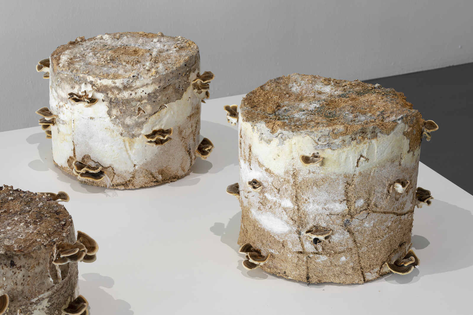 The predominant sounds in “SIREN,” therefore, are nonsense and drones—an undoing of language into various states of nonhuman noise. Rather than creating a cacophony, these works are arranged airily throughout Amant’s three discrete spaces (two linked by a café and courtyard, and another across the street), their sound elements sometimes bleeding into one another, but more typically playing so quietly that visitors need to lean close to the works in order to hear them. Works foregrounding biology include Nour Mobarak’s Fugue I (2019), a tambourine-shaped sculpture of mushrooms and wood pellets containing speakers that play a voice-based sound piece, and Jenna Sutela’s moving-image works, which employ non-human organisms and computer algorithms as language-making entities. Sutela’s video nimiia cétiï (2018) uses a machine learning system to translate a “Martian language” transcribed by the nineteenth-century Swiss spiritualist Hélène Smith into speech and various scripts. She accompanies this sonic material with imagery of a bacteria colony hypothesized to be able to survive on Mars.