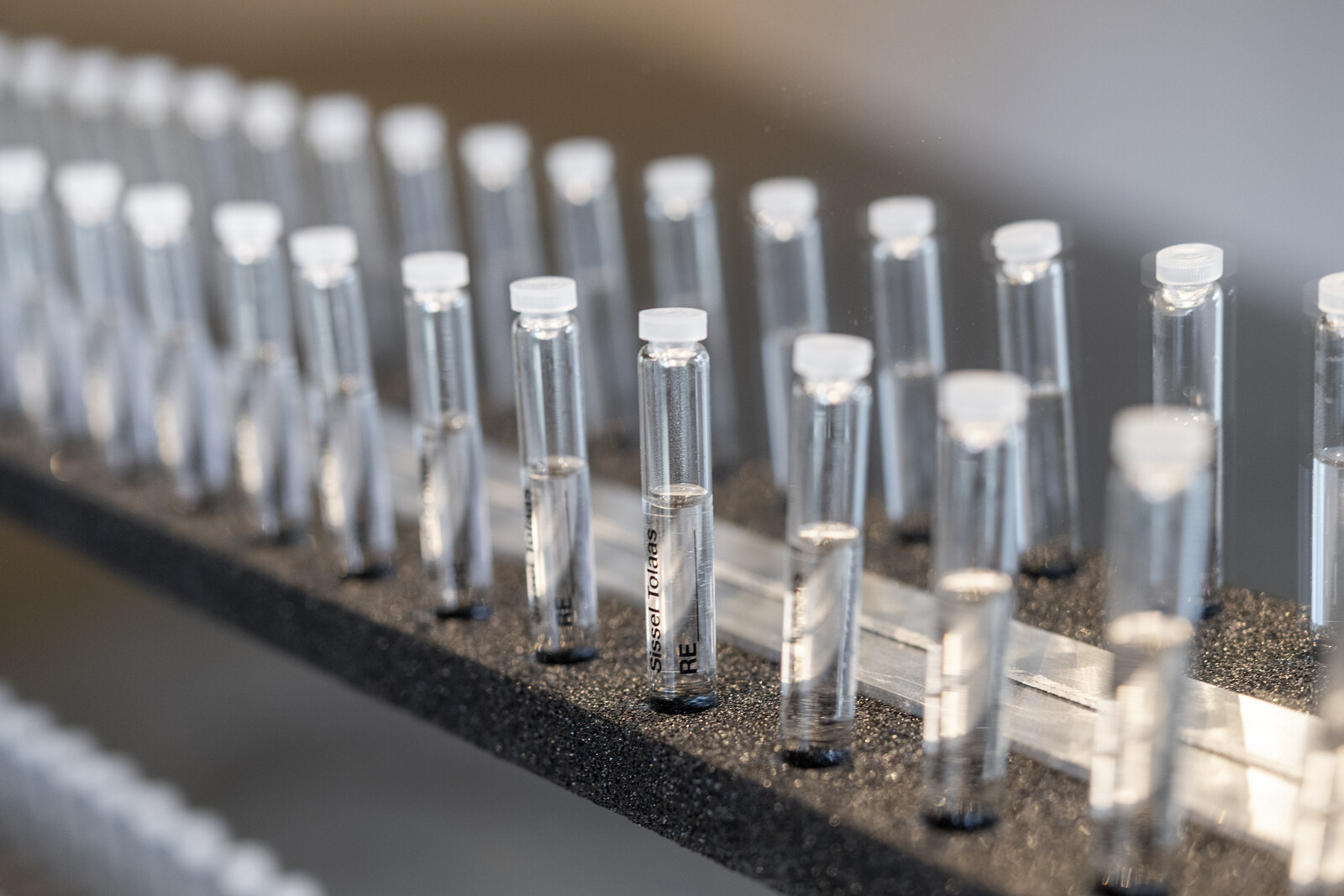 A play on the financial concept of liquidity, Liquid Money_ (Ampoules) (2000, 2004, 2021, 2022) distills the smell of a few hundred thousand dollars into a perfume, presented as a display of tiny glass vials arranged neatly in rows on mirror-backed shelves. Your price of admission gets you a free sample on your way out, allowing you to anoint yourself with an air of wealth at your leisure. Nearby, vah-NIHL-uhhhhh (2022) showcases vanillin, the most popular smell and taste in the world, owing to its presence in breast milk. Burrowing into and out of walls, systems of clear plastic tubing—the sort used in banks and libraries for interdepartmental communication—and HVAC-style aluminum ducts connect the different galleries, spreading each of these smells throughout the building. By creating links through notions of circulation, desire, and value, Tolaas points to how vanilla’s primal and almost subconscious association with comfort and care has been monetized for profit.