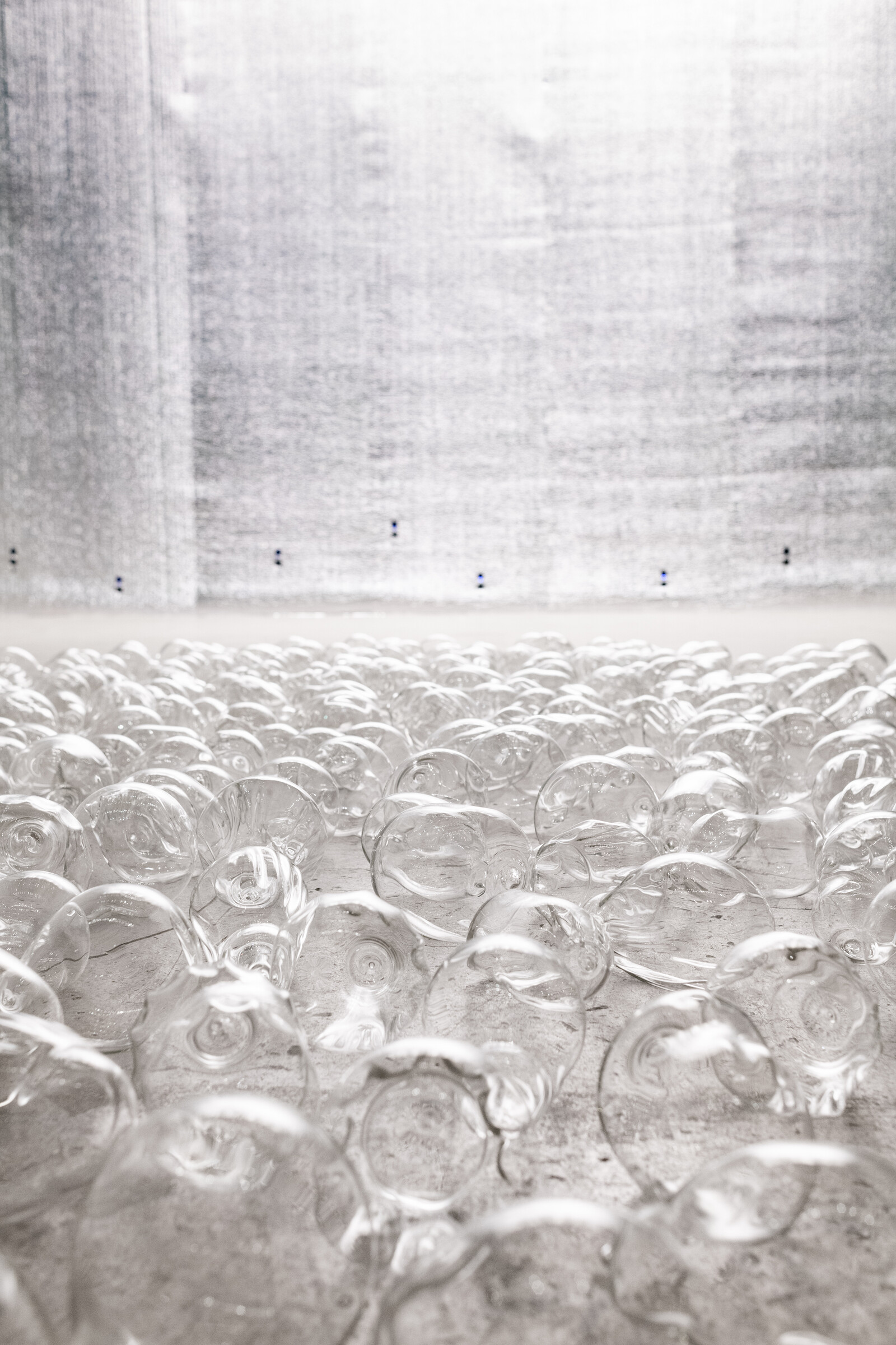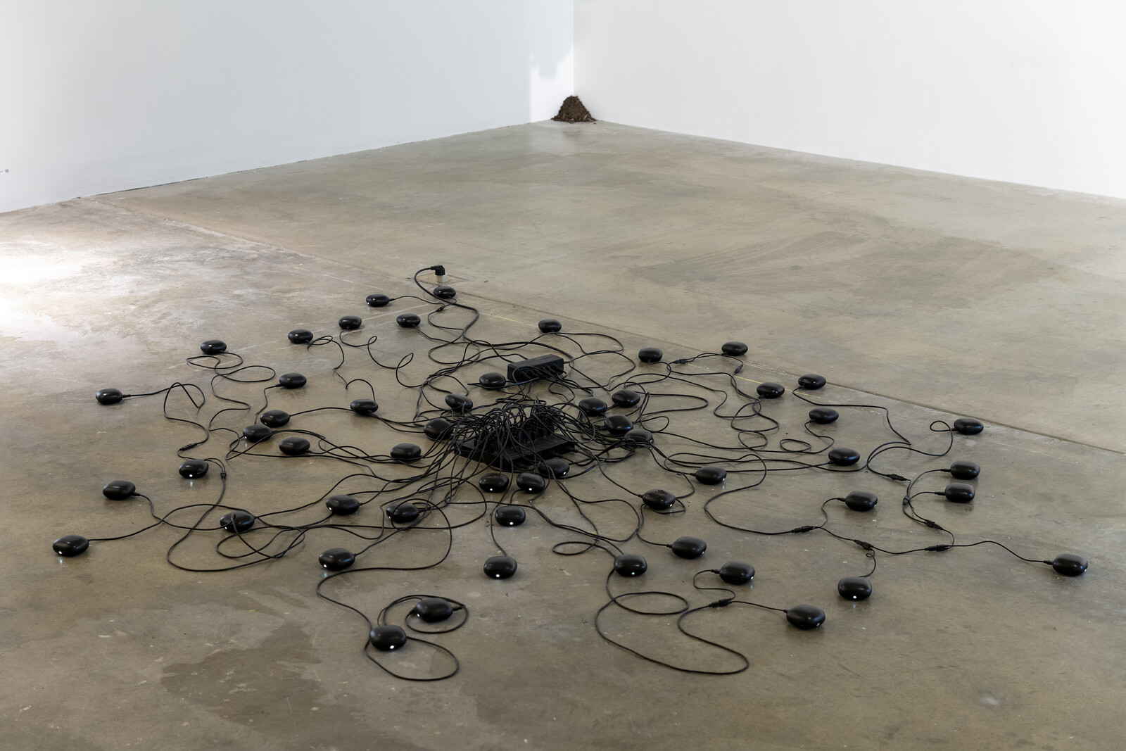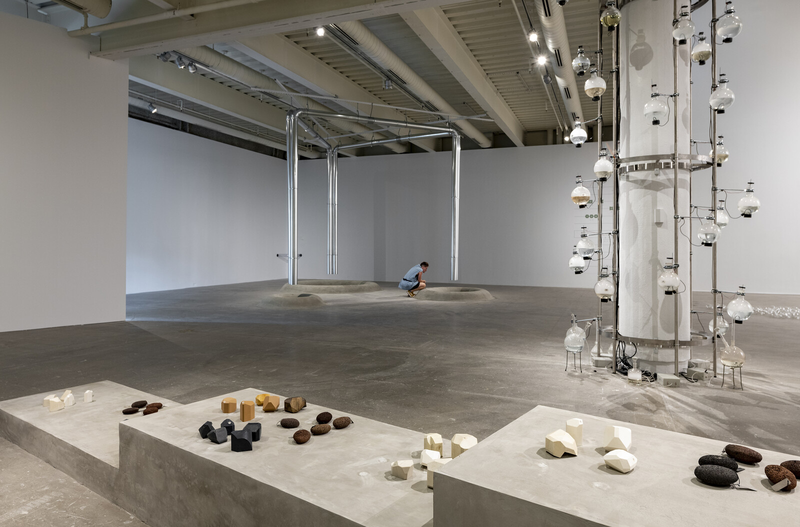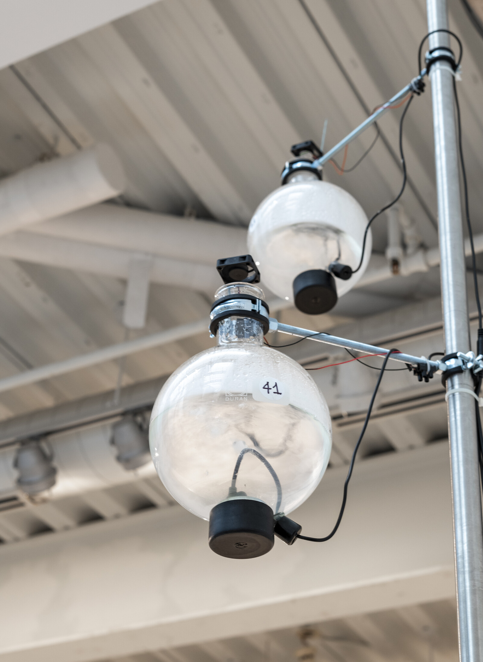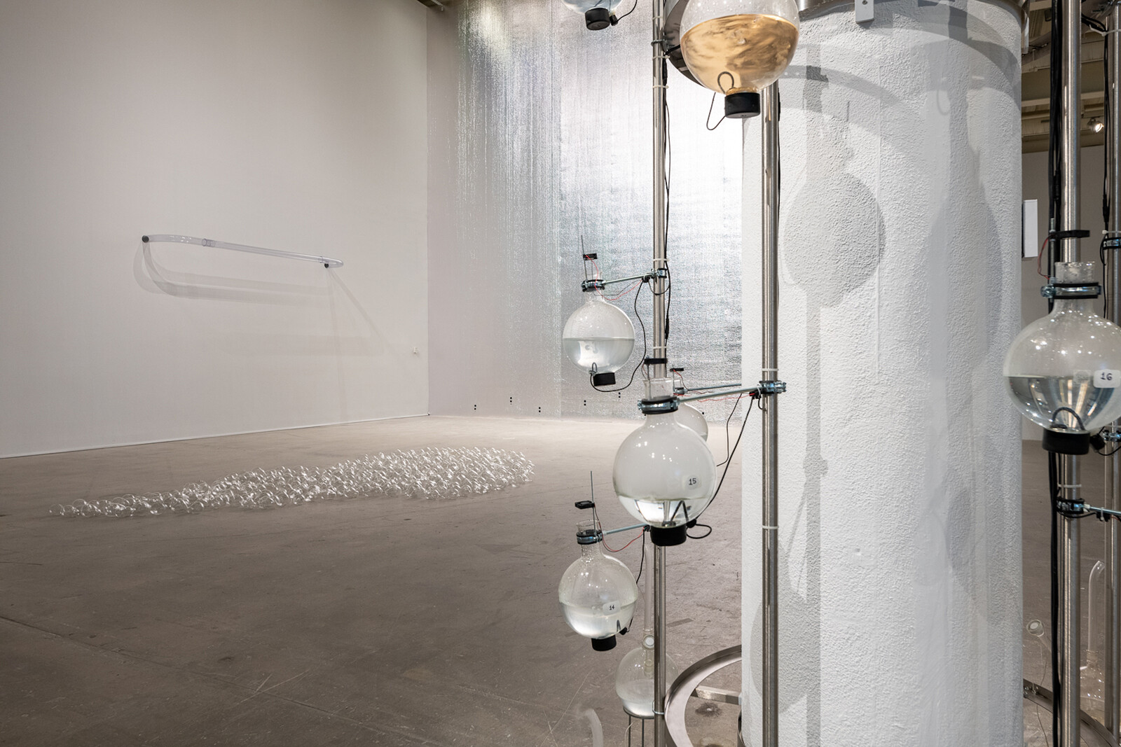 Unlike sight and hearing, which are exercised from a distance, and whose stimuli are physical rather than chemical, the sense of smell is, as literary scholar Hsuan L. Hsu argues, “trans-corporeal,” penetrating our bodies and connecting them, materially, viscerally, to the environments they inhabit.1 This makes them, Hsu asserts, particularly adept at sensing risk, especially in relation to the environment. AirREborn BelowAbove (1994, 1998, 2000, 2007, 2018, 2019, 2021, 2022) uses real-time weather data and fans supposedly embedded with smell molecules recorded on the North Sea to recreate the winds off Norway’s Northwestern coast. I spent some time sniffing around among the diaphanous gray curtains, trying to catch the polluting stink of the oil industry. SYMBIOTIC AGREEMENT AL_earth_22 (2019, 2021, 2022), a set of bubbling liquid-filled round bottom flasks studding a tall column, and D_earth (2022), a dense tangle of diffusers and cables on the floor, both simulated complex and sophisticated chemical communication networks found in nature which, though undetectable by humans, are deeply threatened by their actions.