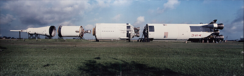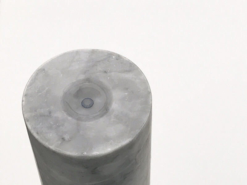 Hooked by the intrigue surrounding the foot, everything else comes to convey the uncanny feeling of a misplaced object. Naufus Ramírez-Figueroa’s precariously balanced mobiles “Revindication of Tangible Property” (2018) evoke rituals of trade and value. Cheap facsimiles of indigenous vases and French-inspired home decor dangle from beams that resemble the scales of justice. They are inspired by Mayan cosmology and also address Guatemala’s post-revolutionary zeal for foreign influence. Tania Pérez Córdova’s sculptures animate their materials using the language of absence. For Blink (2017), Córdova dug a small pool at the top of a marble column, filled it with saline, and preserved a blue contact lens there (the other lens, the materials list informs, is worn by someone, somewhere). There’s surprising congruity between Ramírez-Figueroa and Córdova’s fragmentary approach and Lutz Bacher’s billboard, Rocket (2016–18). Harkening to Los Alamos, the home of the A-Bomb, which is but a 40-minute drive away, it is a found photo advertising an enormous spaceship that has been quartered to reveal its working parts.