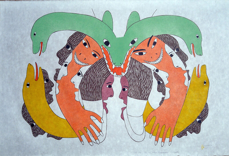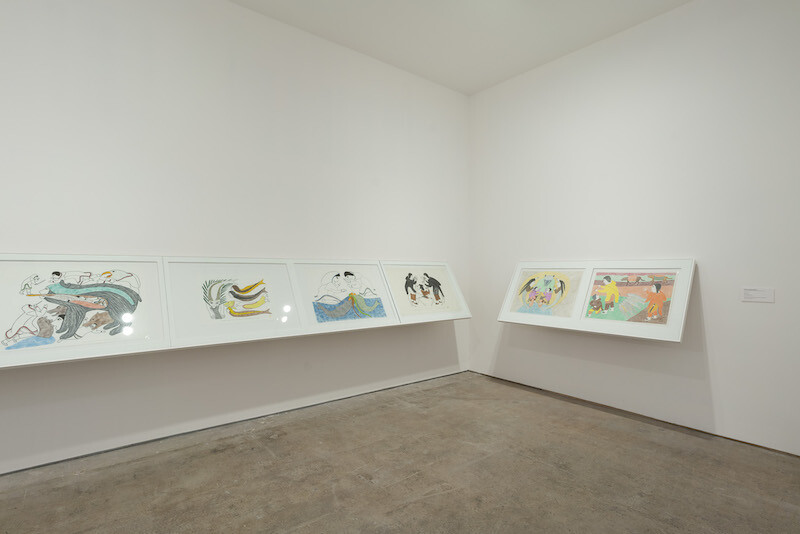 Narrative continuity is no guarantee of political compatibility but it grants the curators the ability to draw connections where trenchant structural boundaries had previously prevented them from doing so. The approach takes shape with prints and tapestries by Canadian Inuit Victoria Mamnguqsualuk, spotlighting their joyful eclecticism. The print Catching the Fish Mother (1979) exemplifies Mamnguqsualuk’s comic parables about humanity’s place in the animal kingdom: two people gently cast their bait, unwittingly fishing for two eager fish in their human likeness. According to Hopkins’s catalog essay, the crisis in the fur trade during the 1940s and ’50s represents an important turning point in how and why much native art was produced. Many native communities turned to the art market, and though necessity clearly granted someone like Mamnguqsualuk a prolific output, and commercial tastes were clearly not incompatible with the humor of her native iconography, the generations that followed have had to contend more directly with the reductivist ways indigenous art has been institutionalized in the mainstream.