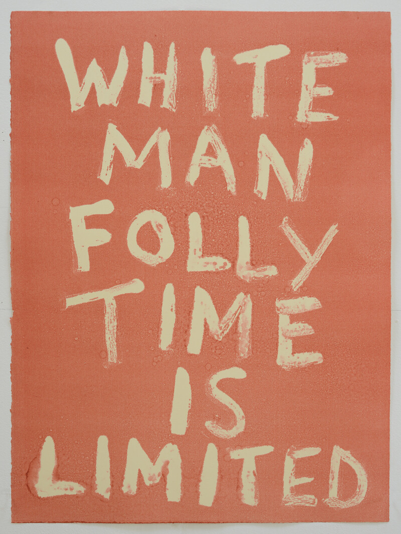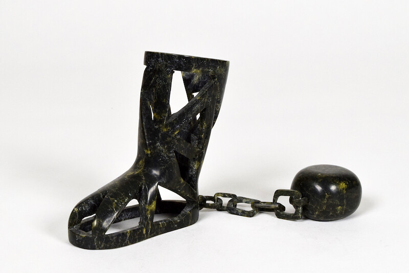 Hock E Aye Vi Edgar Heap of Birds’ Surviving Active Shooter Custer (2018), an enormous grid of monoprints of hand-written texts, combs many unlikely sources for language (song lyrics by The Police, to name one particularly funny example). This artist is enrolled in the Cheyenne and Arapaho tribes, and his wit and democratic sensibility pervades the various phrases. But when they read “Do Not Dance for Pay,” “White Man Follie Time is Over,” or “Stop Active Shooter Cadet Autie Custer,” there’s no mistaking his indictment of ideologically motivated euphemism. Elsewhere, another Canadian Inuit artist, Jamasee Pitseolak’s hand-carved stone tchotchkes speak to the labor and alienation that define indigenous handicraft: Domestic Sewing Machine (2006) depicts a fully functional miniature version of its namesake. What bitter irony that he dedicates all that skill and attention to represent domestic ingenuity, when it resembles thousands of mementos at Santa Fe gift shops. Laden Sole (2004) is more direct. It captures every detail of a boot, and the ball and chain attached to it. Heart-rending, how it could fit in the palm of a hand.