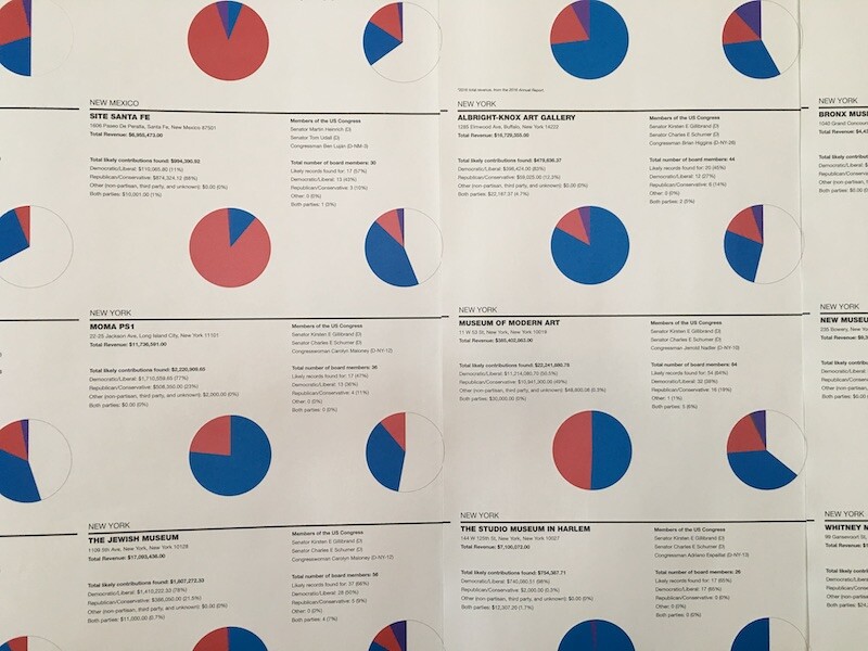 Puns and wordplay put forth potent critiques of institutional transparency, similar to what the curators have done with the foot. Giving artists the keys lends these tactics extra tooth. Stephanie Taylor re-interpreted the artist list as a disjointed heralding song with Press Release #2 (2017–18), which subbed in for the show’s official PR. “Lutz Stacker—Oh no that’s wrong. It’s Lutz Bacher,” a singer corrects himself. (Not only has the audio been sent out to press and listed on the website but Taylor’s comic tribute is piped into the bathroom, too.) Any museum prominently displays their donor list, but, plastered on SITE’s lobby wall, Andrea Fraser’s research project 2016 in Museums, Money, and Politics (2018) charts SITE and other museums’ board members’ campaign donations to the 2016 US presidential election. Gestures like these make the show appear a little self-involved and self-congratulatory, but Fraser’s institutional critique almost turns quaint when introduced by Taylor’s endless puns, and vice versa.