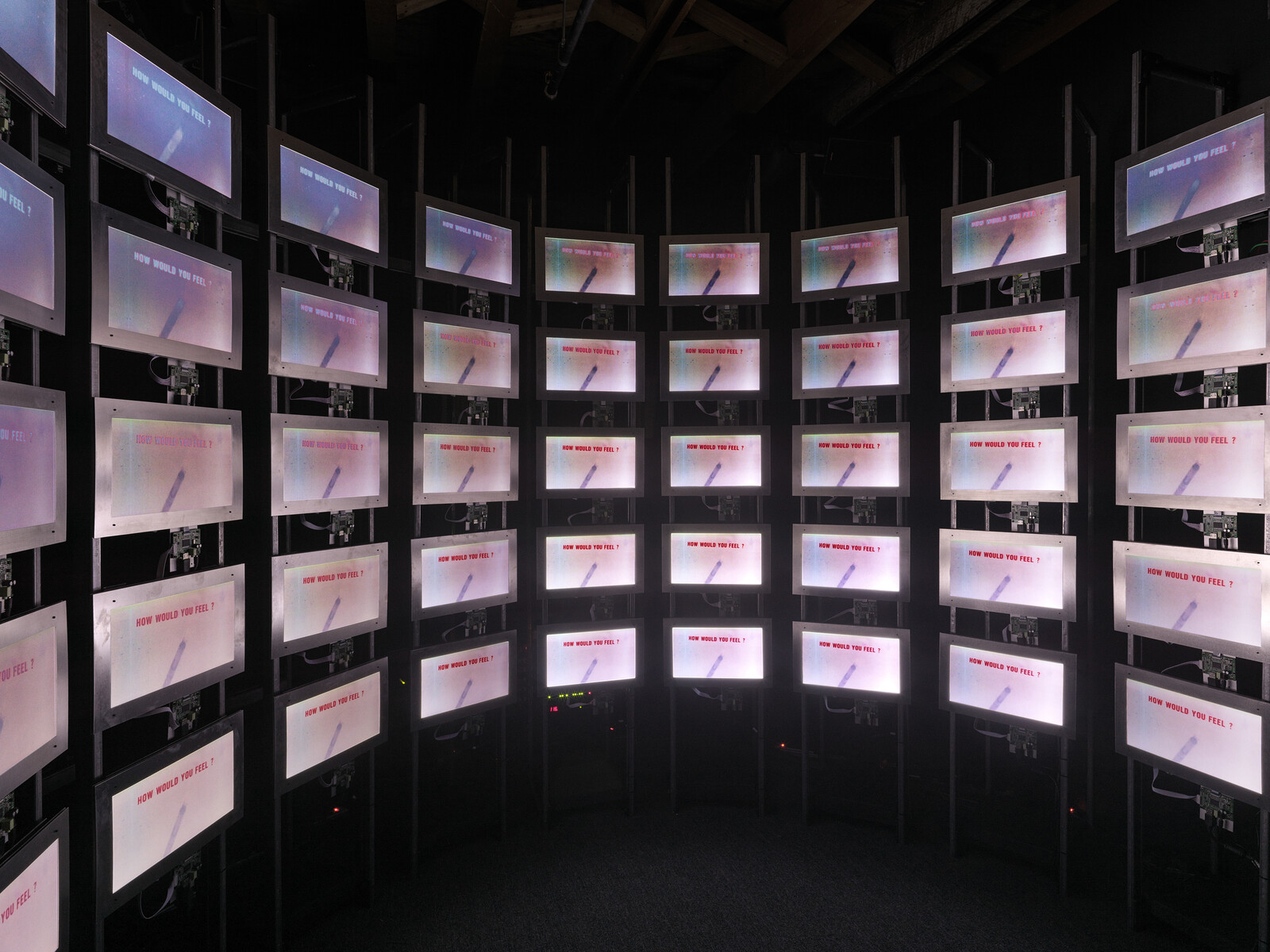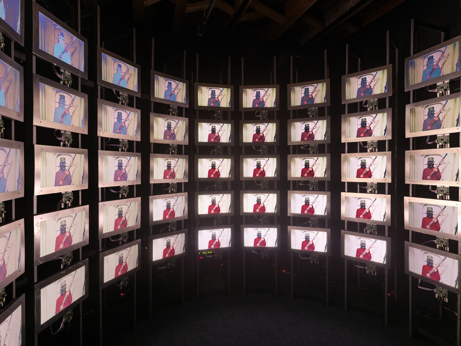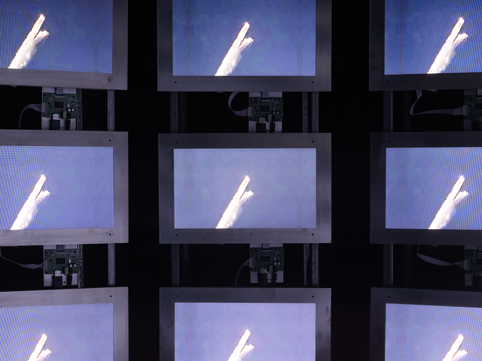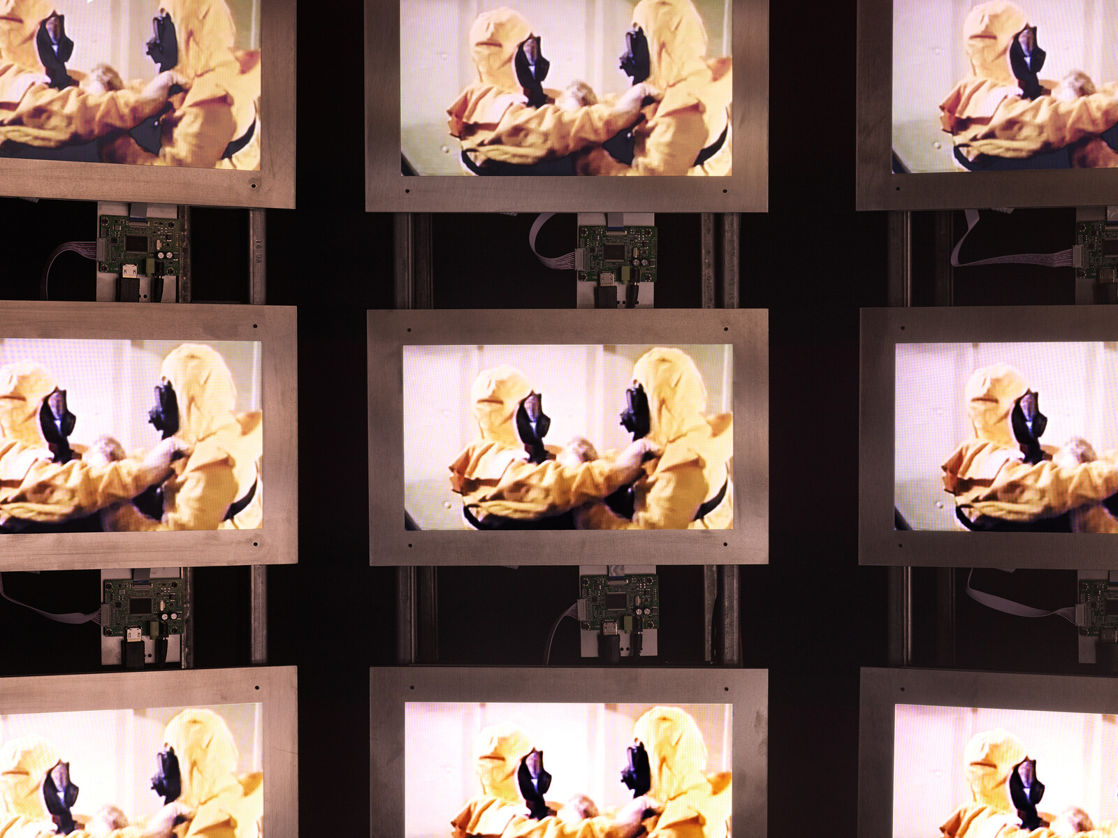 At Pioneer Works, the black-box installation resembles a military command center, curved to simulate the enclosure of a cockpit. The effect calls to mind Charles Eames’s Glimpses of the U.S.A., which collaged thousands of images of “typical” American life into 13 minutes and projected them onto seven massive screens suspended within a geodesic dome. The reference to Eames’s consumerist propaganda, famously displayed at the American National Exhibition in Moscow in 1959, sets a prescient tone for a film that spends nearly half of its 59-minute runtime rehashing Cold War talking points. Playing through five rows of nine LED screens, the thematically grouped footage follows a loose chronological cycle: contemporary displays of military might; US propaganda footage of nuclear testing and safety drill education; the destruction of Hiroshima and Nagasaki; and recent news commentary professing indifference toward the expansion of international nuclear arsenals.