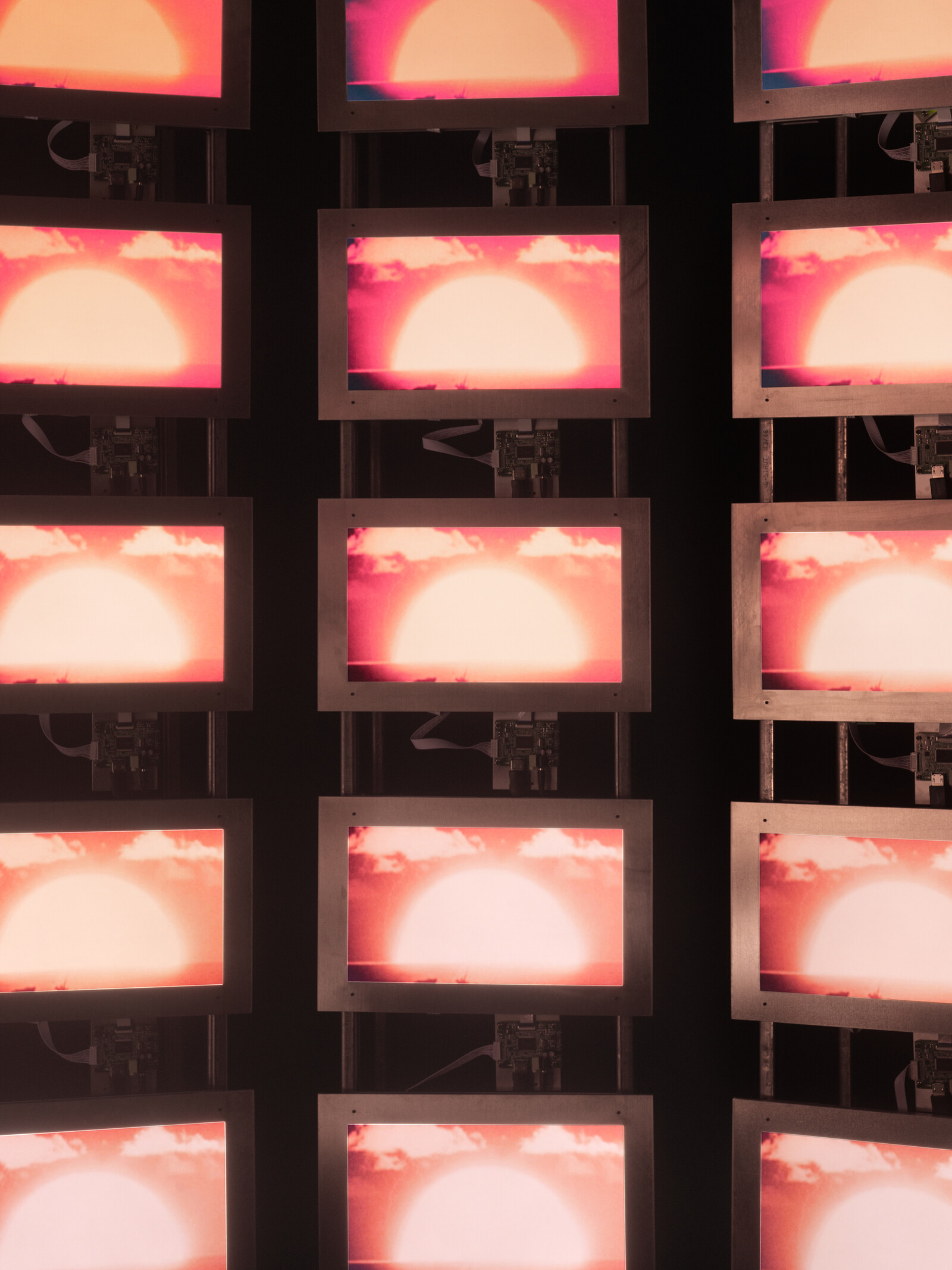 Much of this commemoration takes the form of ironic glorification. Droning house music by The Acid scores footage of military parades. The atomic blasts—which turn the grid of screens into something resembling a Penelope Umbrico print or, more precisely, Warhol’s Red Explosion (1963)—look variously like jellyfish, fuming Corinthian columns, and towering sun gods. During this segment, the couple next to me grasped hands. I initially perceived this as an act of consolation, but later diagnosed a sexual charge. It’s no wonder Keshari cites Carol Cohn’s text “Sex and Death in the Rational World of Defense Intellectuals” (1987) as a source of inspiration for the film’s treatment. After all, it’s Hiroshima, mon amour.