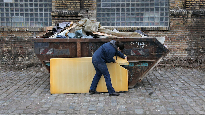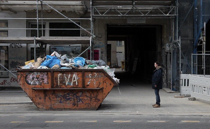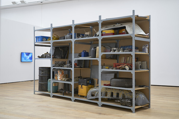 Hultén’s fetishism for the workshop chimes with broader trends. The domestic workshop is a masculine space of retreat, a space of a man’s own that developed over the last century, as labor has changed in the West, and capitalist production systems have made the workshop a private place apart from paid work. A workshop—the real, rather than hobbyists’ kind—has become a curiosity (the popularity of steampunk must in part reflect nostalgia for the now-absent mechanical). In a workshop, actions have purpose, like fixing a broken machine, ordering equipment, or refurbishing a piece of furniture. Hultén often acts purposelessly or counterproductively, however, operating in a realm of surplus activity and found, unvalued material. A counterargument could indeed be made that Hultén produces art objects whose aura imbues them with added value. Nonetheless, the video Immovable Object/Unstoppable Force (Skips) (2012) teases viewers with the idea that an artist’s contributions to society are imperceptible, as Hultén is seen “moving” various dumpsters by telekinesis—they do not budge.