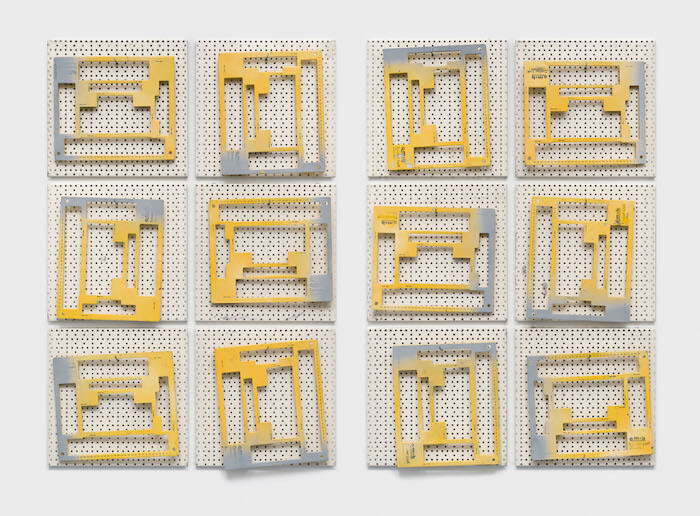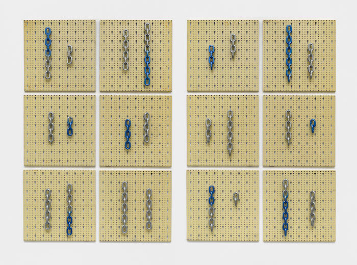I just didn’t get Sofia Hultén’s work Pattern Recognition (2017). Several sets of 12 small perforated metal sheets, like those that hang on workshop walls, are arranged in tidy grids. Each set holds a number of tools or objects, short pieces of chain on one, plastic cutting templates on another, for example. I should have been able to recognize patterns, because the work is inspired by computer scientist Mikhail Bongard’s “Bongard problems,” a series of tests of machine intelligence. But I couldn’t. Eventually—some time later—the obvious dawned on me. I had not to find a pattern within each sheet, or compare each sheet to its neighbor, but identify a pattern occurring in each of a set of six that was not repeated in the opposite six. I had framed the problem incorrectly.