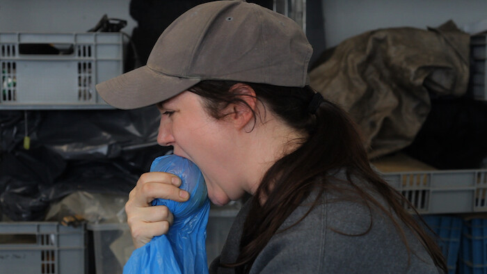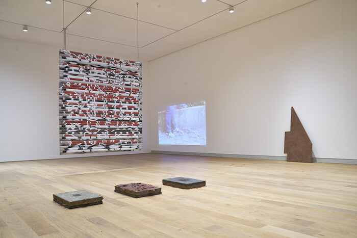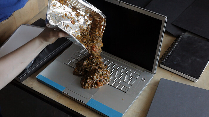 Reframing is an approach that becomes familiar in this survey exhibition, an extended version of which was shown at Ikon Gallery in Birmingham last year. In works dating from 2008 to 2017, Hultén undertakes projects or records actions in which she challenges the logics operating throughout contemporary life and, in particular, surrounding labor and waste. To this end the artist often generates a comprehensible scenario, then undermines the causality we assumed. The video works “Nonsequences” (2013–2014) exemplify this: in Nonsequences IV a laptop is opened, then closed; a takeaway meal is placed on the laptop, then eaten. Afterward, the actions are repeated out of sequence: the laptop is opened inside a hoodie; the food is emptied onto the keyboard before it is eaten. An everyday procedure, remixed, becomes high-risk, though the artist carries out excruciating actions with a sanguine mien (when eating an apple through the plastic bag that might have been the waste bin for the core in Nonsequences I, for example).