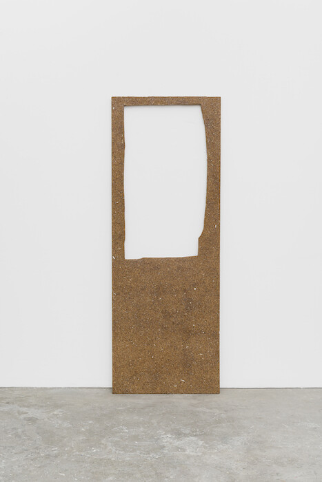 Hultén’s sculptures require skilled labor and her chosen context is the workshop—she appears in several videos in the overalls of a manual worker—and tools are often her media. Effort may, however, be camouflaged; a recurrent idea is of “improving” an object before rendering it back to its original state, or an imitation thereof. A dumpster is taken apart, then welded back together with the sides turned inside out to make On a Fixed Centre (2011)—ultimately, a dumpster becomes another dumpster, and thus as good as invisible. This is beautifully demonstrated at the Museum Tinguely, where it is installed in the customary bin location outside the building against which visitors park their bicycles. In the same vein, Particle Boredom (2016–2017) is a series of found MDF off-cuts from which molds were made; the original board was then ground down and recast, suspended in resin, in the mold of its original shape. They are preserved, but the ambiguous result exists somewhere between protected and petrified.