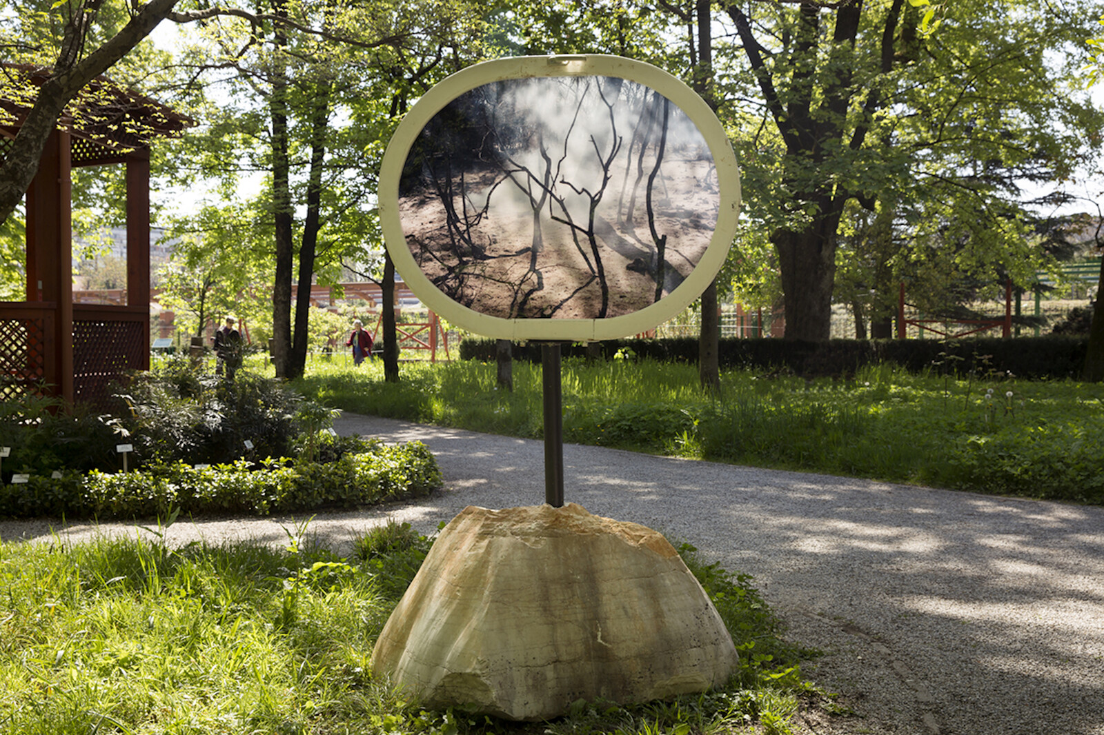 Outside in the gardens are five works from the titular series, “Pendulum” (2022), shown as Duratrans prints, backlit by daylight. Taken the day after a forest fire in Croatian Istria, the photographs show trees silhouetted against white smoke-like shadows of themselves. Each is housed in an elliptical wooden window frame, formerly part of the Art Pavilion offices but another casualty of the earthquake. The effect is both mirror (trees in the botanic garden are reflected in each glossy surface) and portal, inserting a view of one landscape into another. Moreover, the images are mounted on the very terrain they depict: stands made from sedimentary Kirmenjak boulders emphasize the contrast between the laboriously maintained lushness of the urban botanic garden and the torched earth of the world outside.
