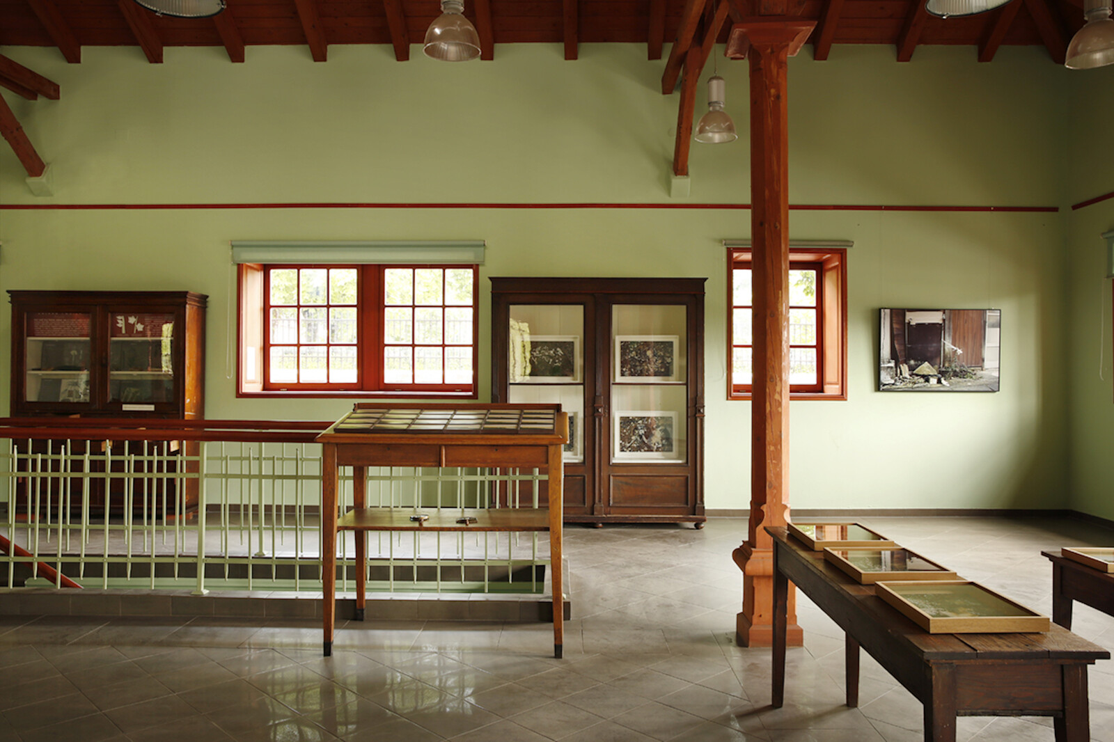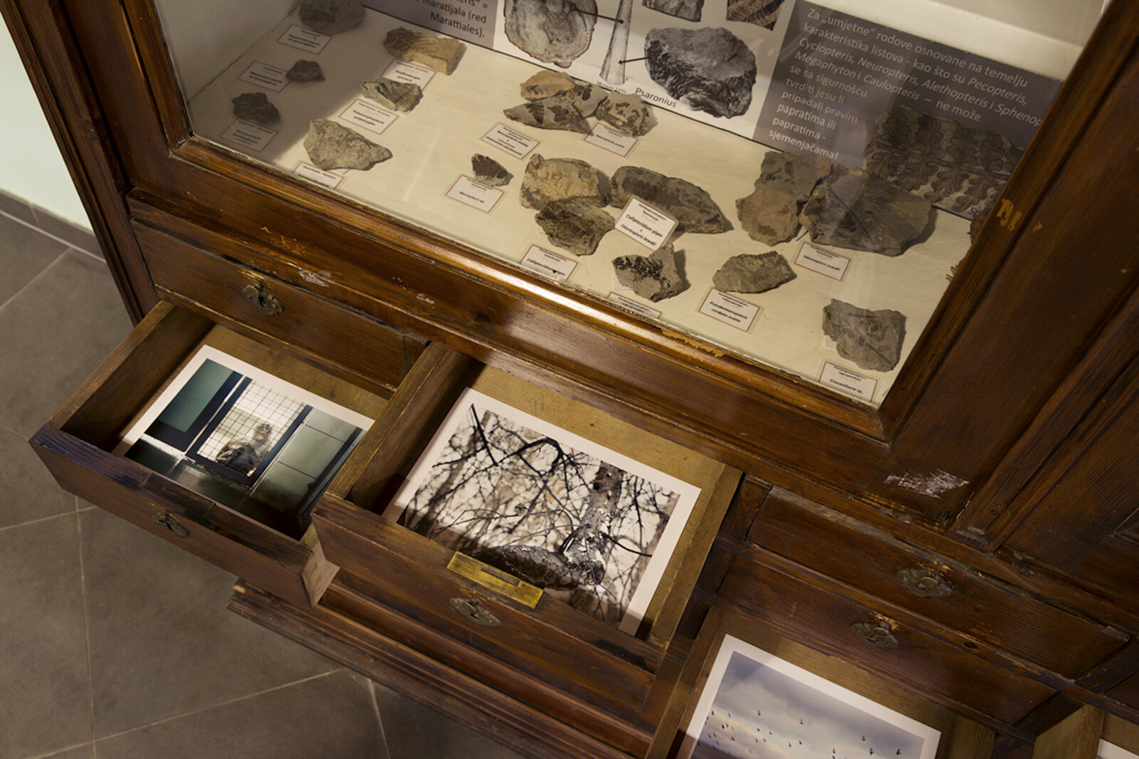“Pendulum” responds both conceptually and materially to this context. The garden opened in 1891, when Croatia was part of the Austro-Hungarian empire. It is a reminder of botany’s proximity to imperialism, and SofijaSilvia effectively unsettles the epistemic hierarchies upon which such institutions were founded. Most of the works are inside a high-ceilinged timber pavilion, built to exhibit wooden products made by prisoners at a forestry exhibition in 1891. Derelict by 1980, and restored in 2007, the pavilion is today used for classes during summer and for protecting frost-vulnerable plants over winter. For “Pendulum,” SofijaSilvia has repurposed furniture found in the building: a lectern, a glass-fronted cabinet, and a chest of drawers used for storing seeds. In four of these drawers are photographs of animals: a flock of pigeons flying overhead, a blue tit turning its back on the viewer, and two images from European zoos—a monkey in Sarajevo and a deer in Prague. Showing these photographs unprotected draws attention to the fragile materiality of the analogue image. That each is isolated in a drawer is suggestive both of captivity (the zoo; the prison) and the predilection for essentialism in western thought (the fixing of knowledge into categories; of life into hierarchies). The faces of the incarcerated animals are heartbreaking.