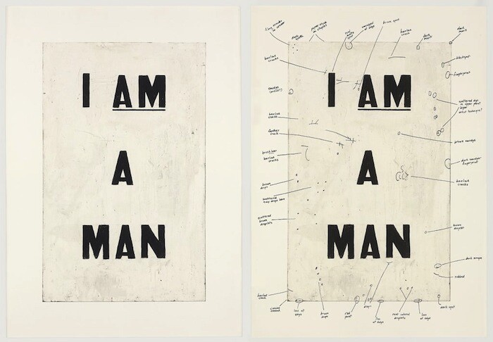 The most important questions raised by the exhibition are asked not by, but of it. Vitrines present pamphlets and newsletters produced by the Dodge Revolutionary Union Movement and the League of Revolutionary Black Workers, two groups formed in the aftermath of the Great Rebellion to demand racial parity not only from Dodge, but also from the United Automobile Workers union. But the exhibition makes no effort to contextualize or explain the unprecedented historical fact of the emergence of a strong and significant Marxist movement organized by African American workers. The exhibition not only omits, but fails even to mention the movement’s definitive accounts: the 1970 film Finally Got The News, produced by the League, and the 1975 book Detroit: I Do Mind Dying, by Dan Georgakas and Marvin Surkin. Hoffmann seems oblivious to the immanent critique offered by Ligon’s sly and bracing Condition Report (2000). Two adjacent prints display the same phrase, borrowed from placards carried by Memphis sanitation workers during their 1968 strike: “I AM A MAN.” One of the two prints also includes some three dozen handwritten comments identifying blemishes and smudges on the print’s surface. Here, in distilled form, is the operational logic of the exhibition: struggle as adornment, history as raw material for the culture industries.