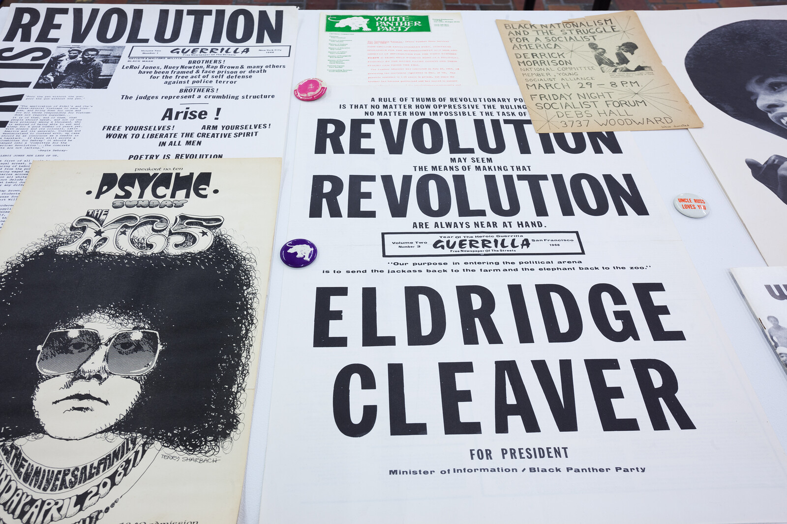 Early in the exhibition, we encounter four of Emory Douglas’s vivid graphics for the cover of The Black Panther newspaper. One issue proclaims 1971 “The Year of the Youth” and features a black boy, rifle in hand, challenging the camera with an expression of anxious recalcitrance. Later, a 1969 photograph depicts hard rockers the MC5, de facto figureheads of the White Panther Party, also holding rifles, victoriously above their heads, alongside a guitar and a saxophone. Douglas’s insurrectionist agitprop and the MC5’s publicity photo are granted a material equivalence via their treatment in the show—both are framed and hung as “works.” This material equivalence suggests an historical equivalence that is, in fact, equivocation, perpetuating the same distorted racialization that it blithely presents. The Black Panther Party was a revolutionary organization, which developed programs and platforms to oppose entrenched white power, while also providing essential services to the black community. Their leaders were systematically persecuted by overt and covert law enforcement efforts. Many were jailed. Many were murdered. The MC5, on the other hand, was a rock band. Its association with Detroit’s head beatnik, John Sinclair, connected it to the nascent White Panther Party, imagined as a sympathetic white counterpart to the Black Panthers. But the White Panther Party never materialized as a political or social force, and its greatest impact was as a marketing campaign for the band. “Sonic Rebellion” offers no tools to distinguish these histories and meanings.