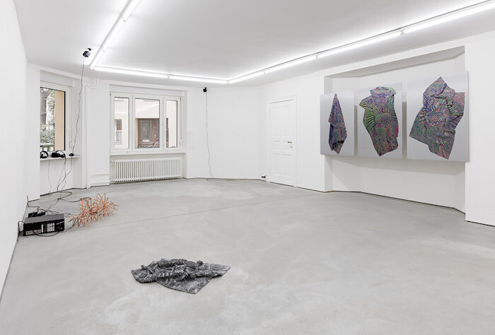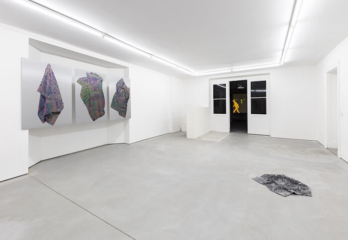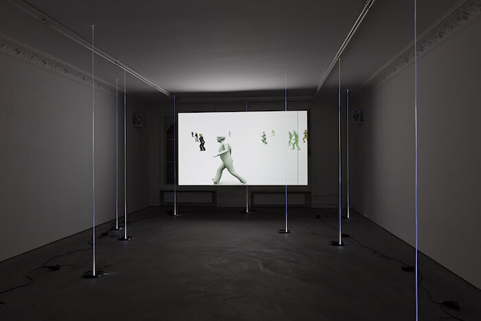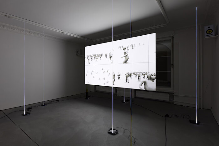 In Hadjidjanos’s video, rough and clunky outlines of figures running across a gridded plane gradually become fully fleshed humans with outfits and facial features, demonstrating how a series of programmed commands quickly transforms into convincing creatures. Likewise, the crowd’s backdrop becomes gradually more lifelike, and is soon recognizable as Berlin’s Potsdamer Platz, a stone’s throw away from Future Gallery. An eerie soundtrack plays muffled, slowed sounds, which one learns from the press release are adapted from phone recordings made by civilians during the deadliest suicide attacks over the past year, such as those in Nice and Baghdad.