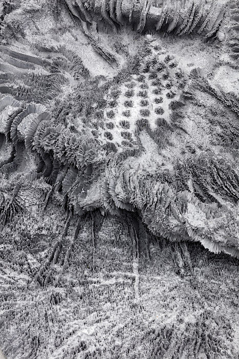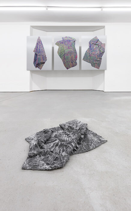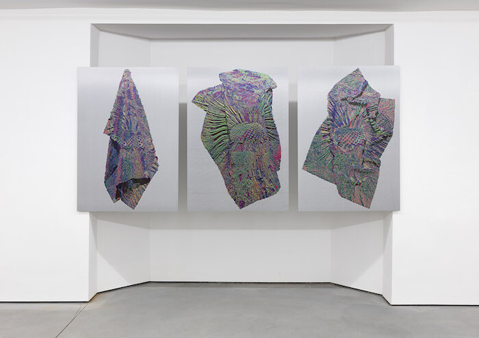 In contrast to the futuristic nature of the VR work, another series united under the name of “Taraxacum Officinale” (2016) refers explicitly to the historical lineage of mechanical image reproduction. In 1930 the German photographer Albert Renger-Patzsch, a prominent proponent of the New Objectivity school, published a book of flower photographs, including one of a dandelion seed head. The dandelion image is reiterated in each work of the series; for Taraxacum Officinale (xy), the flat image has been extruded with software into three dimensions, and then 3D-printed in aluminum, resulting in a sculpture laid on the floor. For Taraxacum Officinale (zx), (xy), and (xyz), the 3D image itself is then once again flattened, then computationally rotated to be seen from three different angles, each of which is printed on a canvas of woven carbon fiber. If aluminum was the physical substrate of the modernist industrial era, perhaps carbon fiber is this era’s.