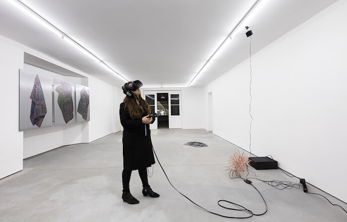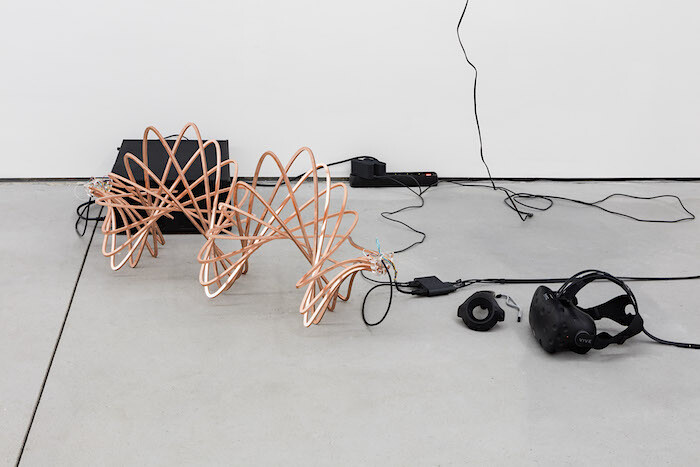 For the ambitious work HD/VR Sculpture (2016), Hadjidjanos employed the help of programmers at a Berlin start-up to create a virtual reality landscape. This work forms a new iteration of a long-running series of sculptures in which thick copper wires twisted into the approximation of a 3D sine wave are used to transmit data. Each passive-looking copper object becomes an active conductor as soon as wires are hooked up to both of its ends. In this case, data is sent via the sculpture from a computer to a VR headset. Putting on the headset, one’s perspective is suddenly swung off-kilter: one finds oneself looking up at a giant simulation of the copper sculpture itself. By pressing a button on a hand-held controller, the user can teleport between two scenes (one abstract, the other a kind of lunar landing pad in the midst of a solar system) to view the giant version of the sculpture in different settings.