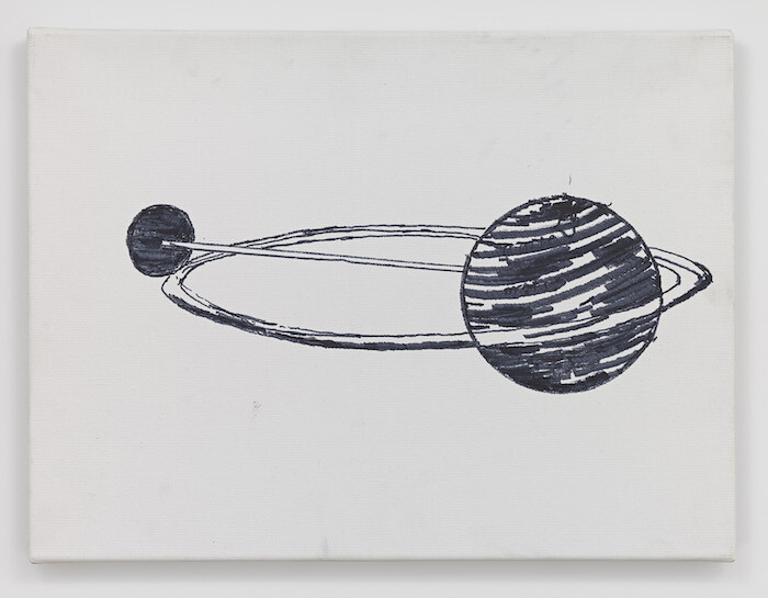 Daniëls, who suffered a cerebral hemorrhage in 1987 at the age of 37, and has only made work sporadically since, was initially received as a Neo-Expressionist, a movement known more for the expulsion of sweat and blood onto canvas than critique of the broader art field. Yet Daniëls’s work—and the present exhibition, whose title “Sputterances,” a portmanteau of sputter and utterance, derived from a poem written by the artist—suggests that this is hardly a neither/nor proposition, and that, rather, expression is tied to the mutual dependence of sense and nonsense, central to which is the question of the frame.