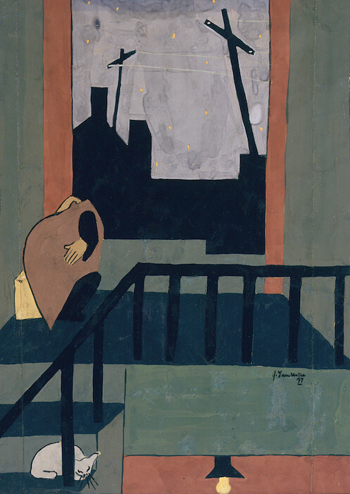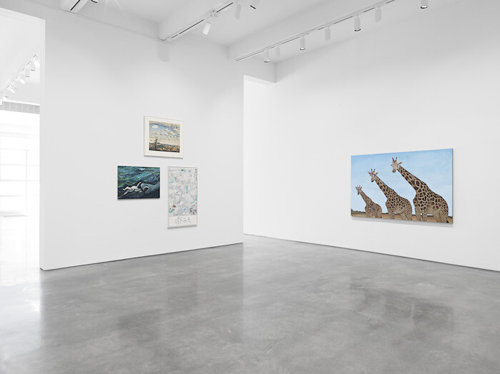 Formal resonances abound in this show, both across works in the exhibition and with Daniëls’s oeuvre as a whole. Celestial bodies, a persistent motif in Daniëls’s work following his stroke, are depicted here in his only work from this later period in the exhibition, 2006’s The Most Contemporary Picture Show, as well as in two more recent canvases by Mathew Cerletty (What’s the Feels Like?, 2017) and Walter Swennen (Wind Blue, 2015). The giraffes that occasionally appear in Daniëls’s paintings, redolent with themes of colonial expansion, are echoed in Leidy Churchman’s 2017 painting. Titled Free Delivery, it doesn’t look like the elder artist’s work so much as the three giraffes staring out at the viewer evoke its disorienting humor. A shared color palette of deep, earthy reds, blues, and greens leads to an unexpected synergy between the stunning nighttime tableau of Jacob Lawrence’s painting Christmas in Harlem (1937), and the moody abstraction of Monique Mouton’s St. Patrick (2016).