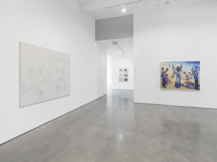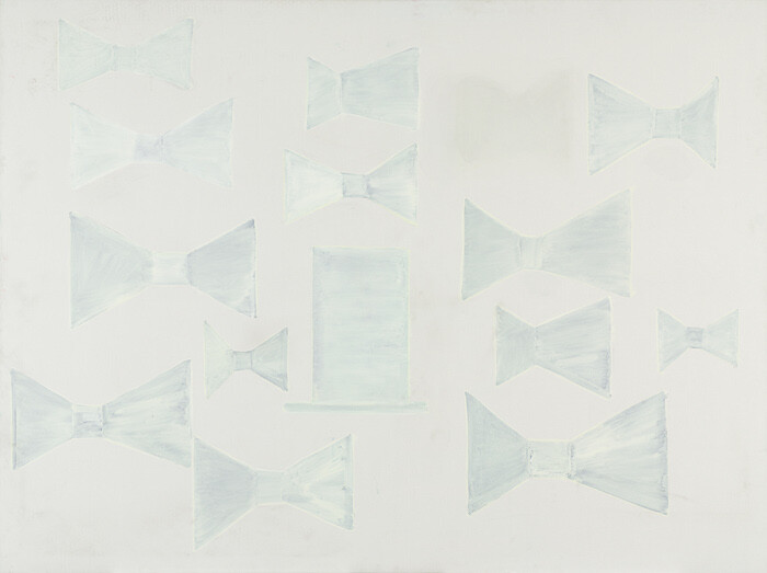 Besides Daniëls’s aforementioned painting, “Sputterances” contains two works completed in the initial phase of the artist’s career. The half-articulated forms of Hey verloren huis teruggevonden (The lost house found) (1982-83), where a wine glass seems to merge with a woman’s face amidst a sea of sickly green, collapse figure into ground and show the artist under the influence of surrealist automatism. More striking is Zonder titel (Untitled) (1987), part of a series of work in which Daniëls rigorously explored the art gallery as a kind of stage, insistently populating his canvases of this period with a mise en abyme-like diagramming of the white cube. Often, as in here, where they are set against a simple off-white background, these perspectival renderings of gallery walls are abstracted to form another immediately recognizable motif with its own rich set of performative connotations, the bowtie. Painting, this body of work seems to say, is at heart a theatrical practice. To return to an earlier question of framing, Daniëls’s painting isn’t expressive, but rather provides the parameters under which the artist can inhabit different modes of being. The present exhibition not only recontextualizes Daniëls’s work among painters who both preceded and followed him, but seeks also to bring a whole community into existence, however transitory it may be, through Kantarovsky’s own encounter with him.