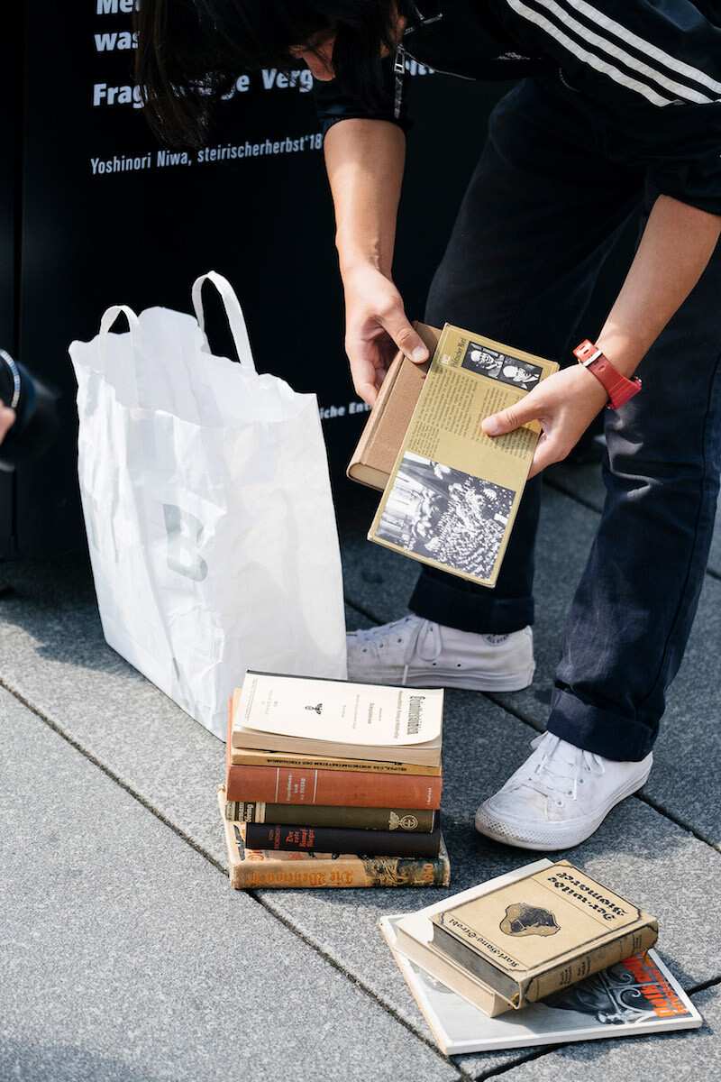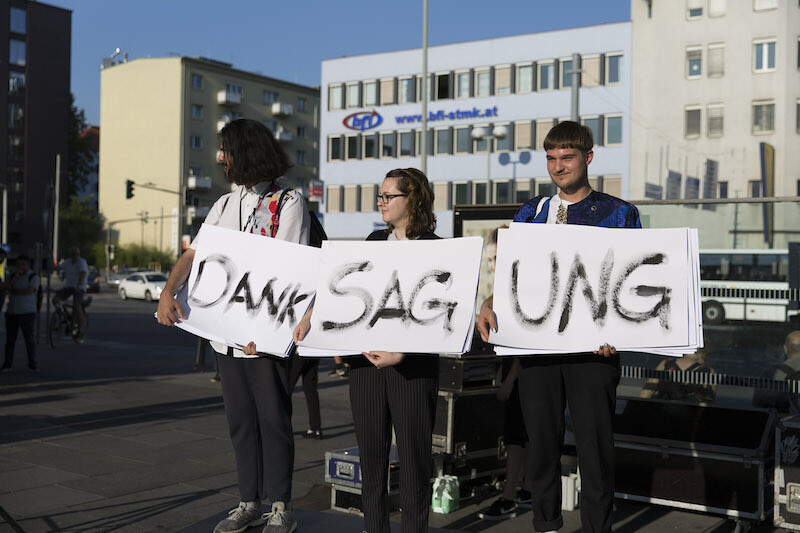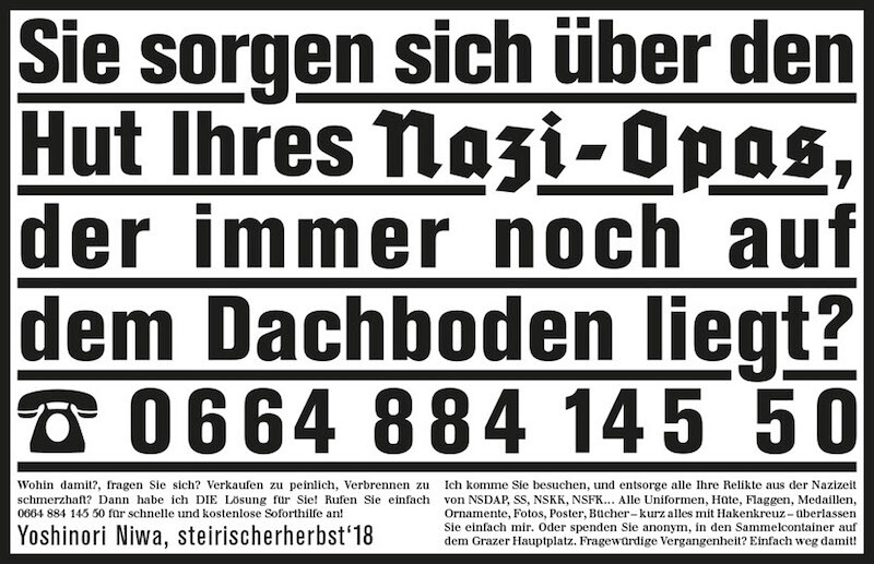 To inaugurate the festival, and her five-year tenure as its leader, curator Ekaterina Degot presented an opening speech in the Europaplatz, a central square in front of the city’s train station. When in transit, polite strangers typically say “excuse me” to initiate conversation. Following this convention, Degot let forth a rhetorical line of questions with “Excuse me, do you know where the tram stop is?” and so forth. These banal queries then moved to far more serious and personal questions such as “Excuse me, are you for immigration or against it?” Degot then asked the crowd, numbering possibly over a thousand, “Excuse me, do you have Nazi memorabilia in your home?” A noticeable round of chuckles rippled through the air, while I, the descendant of German Jews, put on my best grin in a country ruled by a conservative coalition government prominently featuring the far-right Freedom Party of Austria (FPO), an anti-immigration nativist organization founded in 1956 by a former SS officer. Like a motif from an opera prelude, Degot’s remark was foreshadowing.