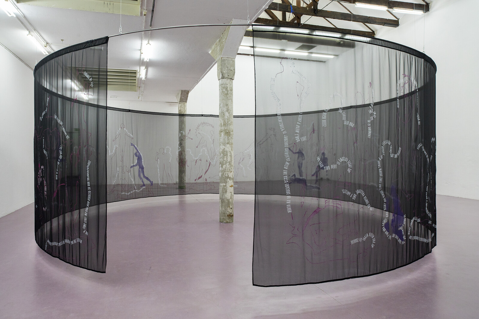 Philipp Gufler (also the exhibition’s curator) provoked another type of bodily recognition in the visitor. In Quindo Violett hell, PV 55_Rebschwarz_Nickeltitangelb (2022), mirrors painted with silkscreen prints implicated the visitor’s body in the act of seeing and being seen through various colour reflections. This play on the body—mine/yours/ours—recurred throughout the show, in ways that depoliticized legible representations of the single body whilst politicizing its multiple obscured presences. Through Gufler’s Body/Text (2023), a large circular structure of a hanging textile work installed in the middle of the exhibition, outlines of bodies silkscreened onto the sheer fabric could be seen standing, sitting, and lying on other artworks. The work featured eighty-four unclothed and non-binary bodies taken from painted figures in Elisàr von Kupffer’s Die Klarwelt der Seligen [The Clear World of the Blissful] (1923–30), a panoramic tableau depicting a queer utopia where bodies and nature seem at one with each other.