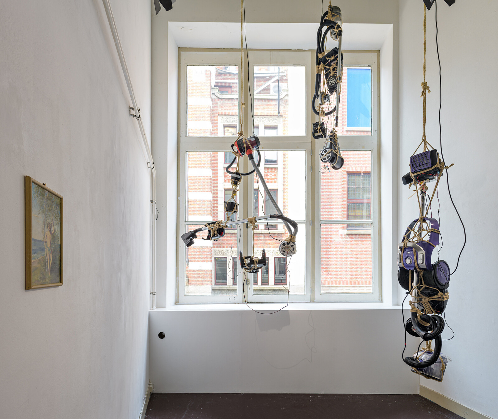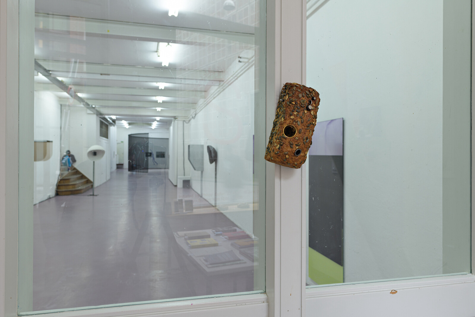 Johannes Büttner’s sculptures of loaves of bread pierced with flesh-tunnel holes were hung on the wall and propped on shelves at the entrance and in the gallery’s reading room. Recalling the literal and symbolic body of Christ, the works invoke St. Thomas the Apostle’s insistence on probing Christ’s flesh—not satisfied with seeing and smelling his wounds—to satisfy his own doubts. It’s a way of relating the reality of others’ experience to acts of consumption, demands of proof of suffering, and death.
