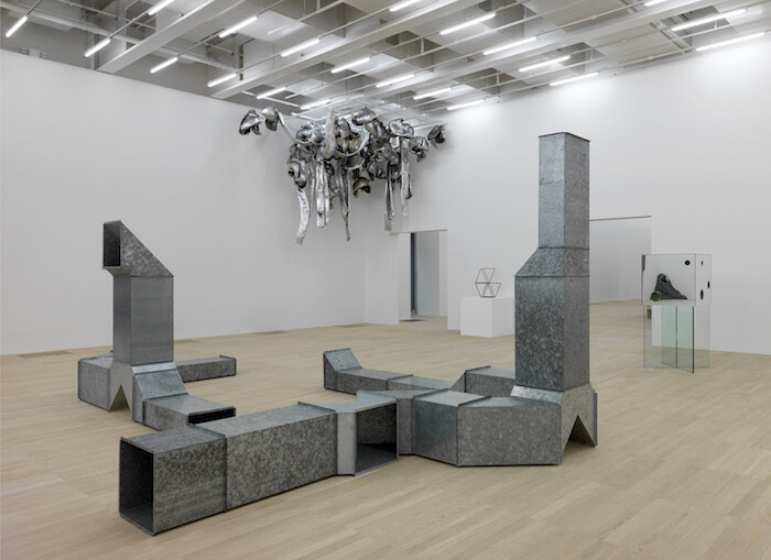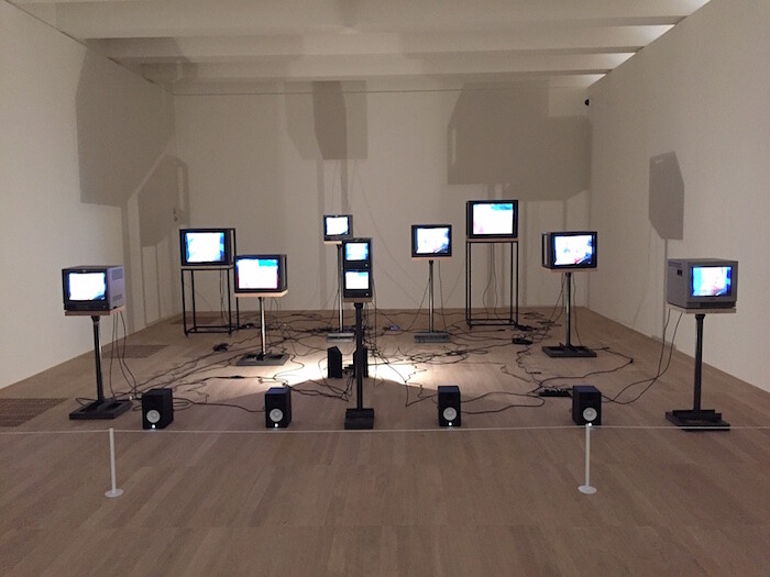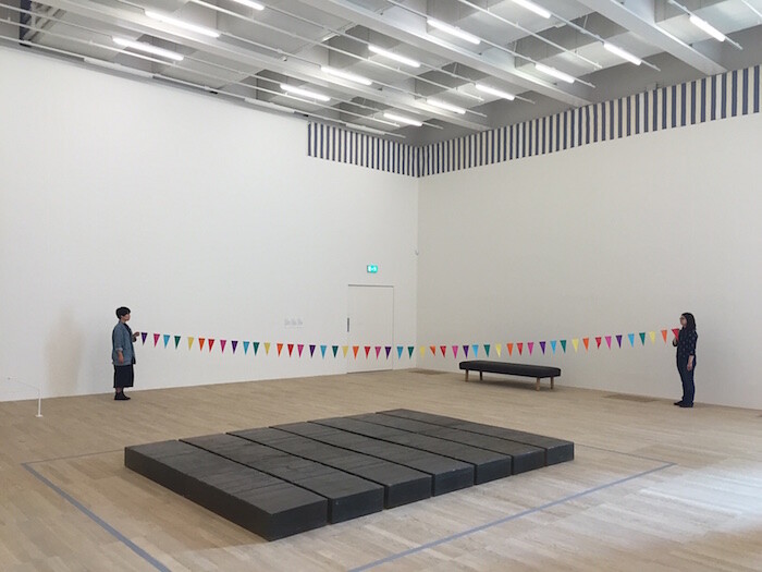 That this occasionally feels like an expression of how art history should have been, rather than how it was, is one objection. The sometimes unimaginative presentation of the work is another, with monumental sculptures ringed around by works hung on, or pressed up to, the wall: Bruce Nauman’s Corridor with Mirror and White Lights (1971), for instance, is pinned to the back of a capacious new gallery devoted to minimalist sculpture. This somewhat drab display of vast, geometrical forms in post-industrial materials—only partially enlivened by the peephole menace of Mike Kelley’s Channel One, Channel Two and Channel Three (1994) and Joan Jonas’s performance film Songdelay (1973)—betrays an attachment to the densely theorized artistic revolutions of the 1960s that (depending on your taste) either anchors or skews the museum’s replenished collection. Amidst all the jagged steel and concrete, the colorful bunting held aloft by two previously unacquainted performers for Amalia Pica’s Strangers (2008) feels more like a concession to the need to seem innovative, contemporary, and interdisciplinary than an integral part of a coherent display.