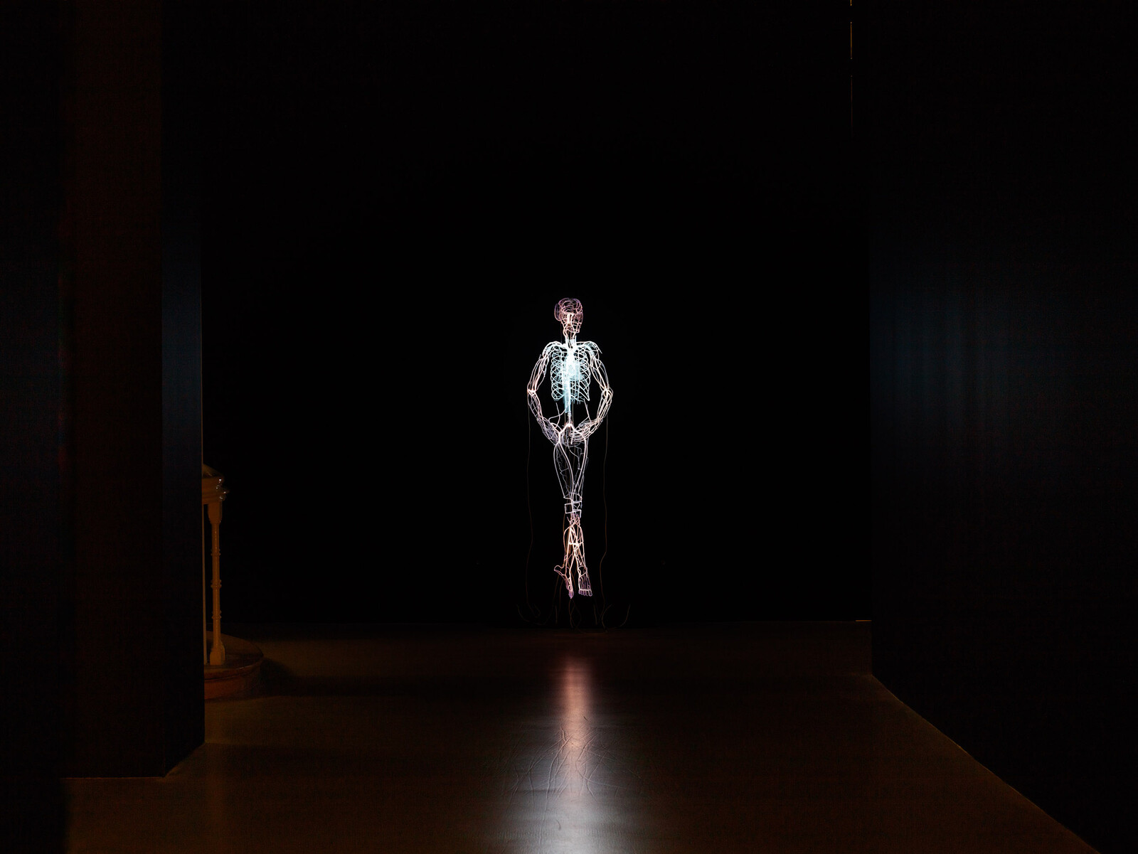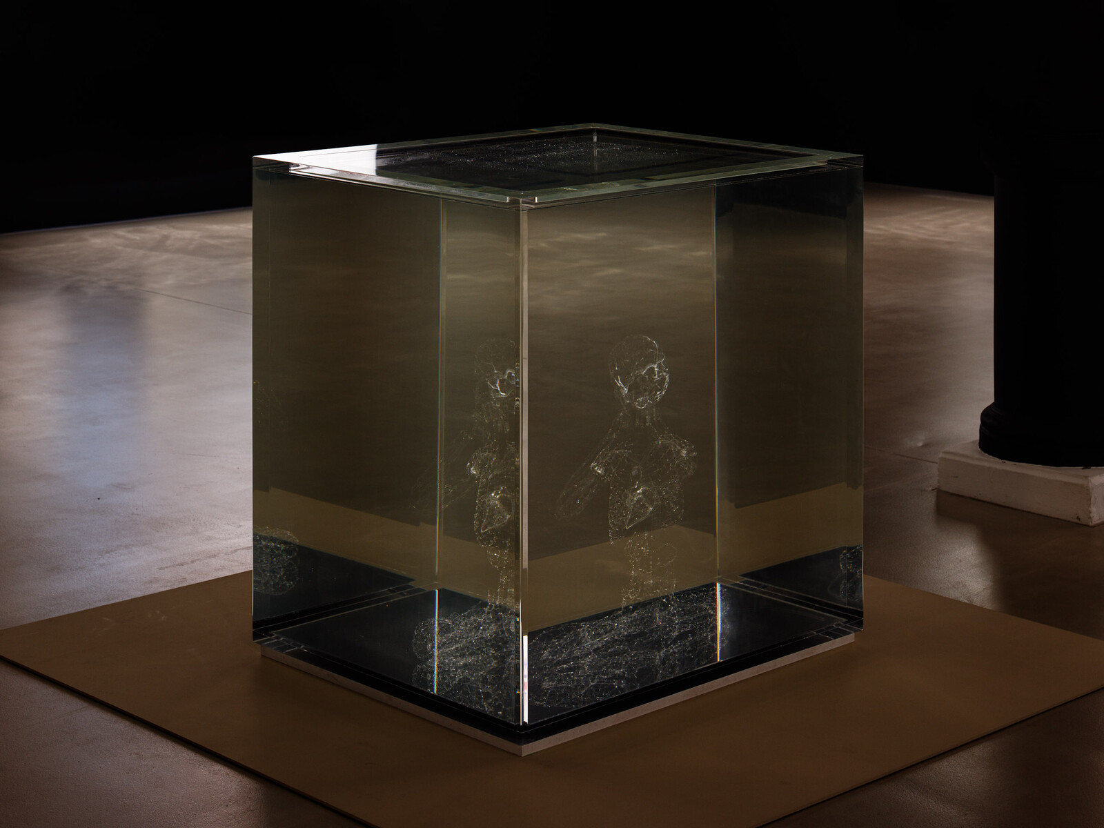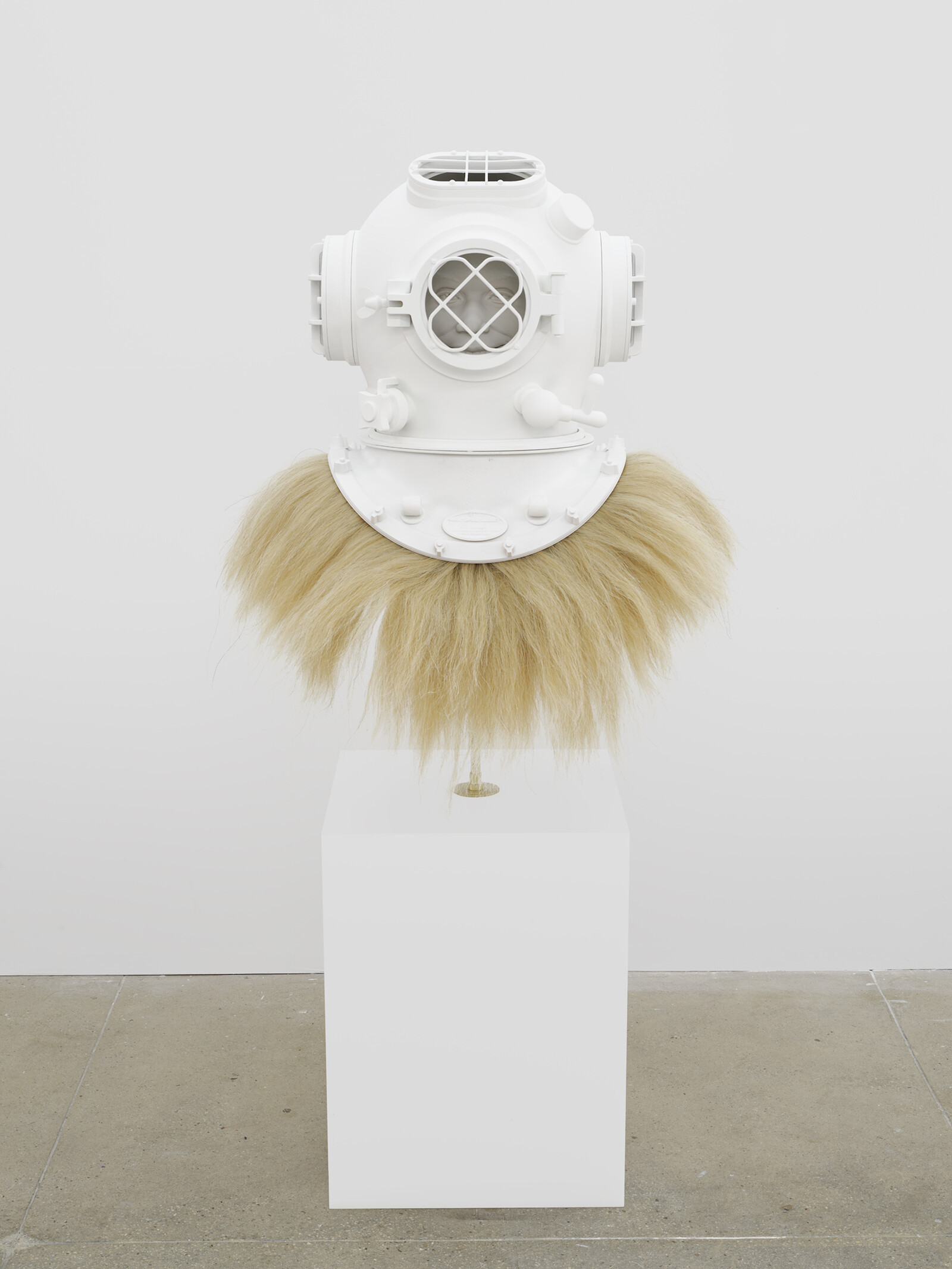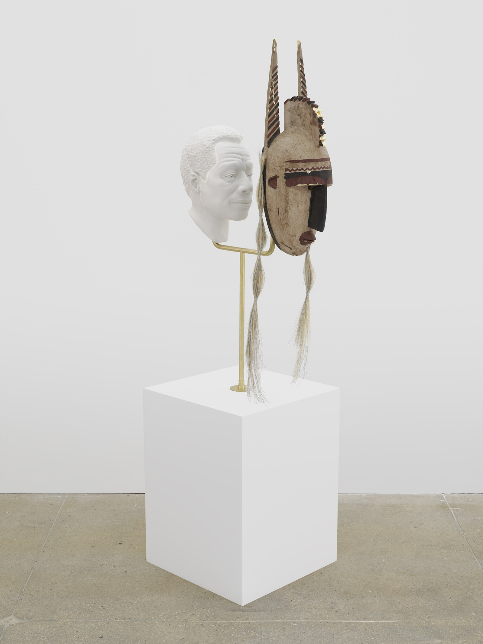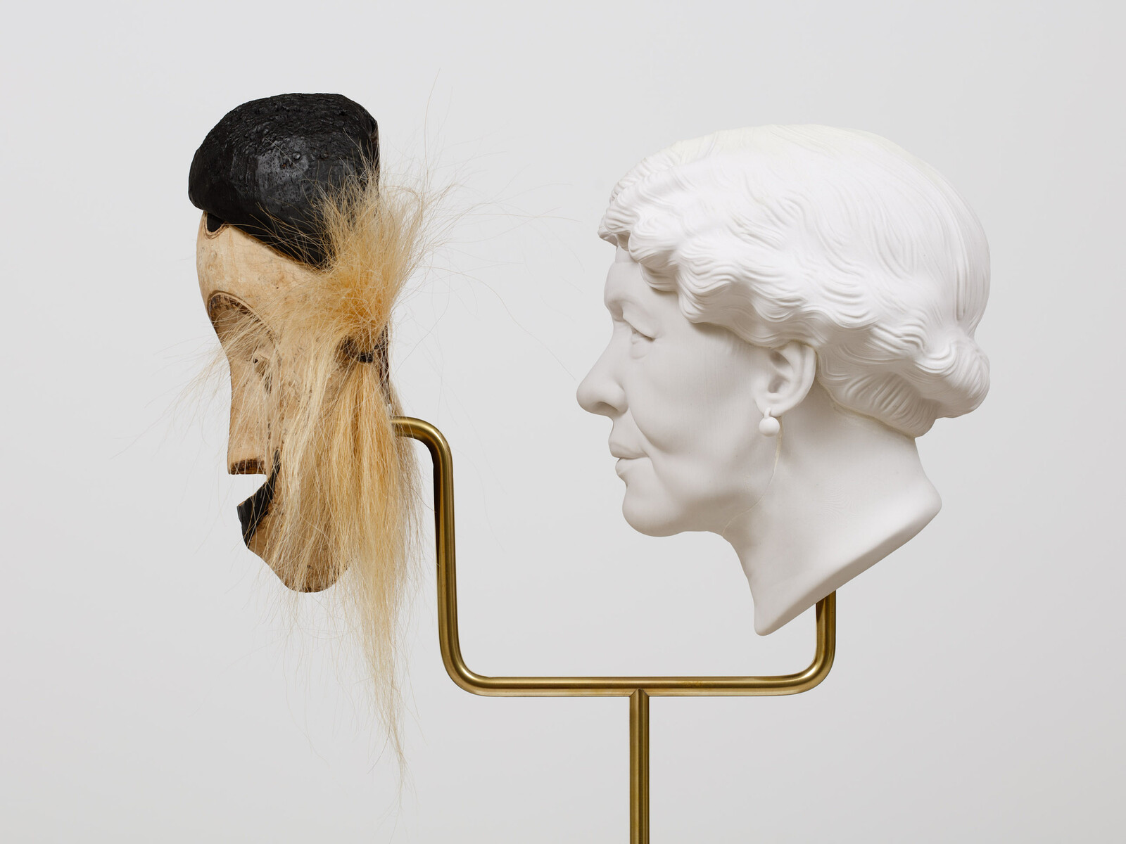 Then there is singing. From the stairs leading to the top-floor gallery comes a man’s baritone. He is joined by two women, who come out of two rooms hidden in the sides of the gallery where EIGHTEEN NINETY is displayed. In one, the man reads to the young woman about Henson. She listens, but also insists; she keeps correcting the book. When he reads “Eskimo” she overtakes him, saying, “Inuit.” It becomes unclear who is telling which story to whom, or at least, who is insisting on which history. The other woman, wearing a white lab coat, sings about HeLa cells. Henrietta Lacks—the African-American woman whose cancer cells were taken without her or her family’s consent and have been used in research since her death aged 31 in 1951—also makes an appearance in the upstairs gallery. Distant Relatives (Henrietta Lacks) (all works in this series 2020) combines a Kifwebe Song Mask from the Democratic Republic of Congo with a plaster, brass, and acrylic pedestal. It’s one of twelve sculptures dedicated to different men and women that bring together African masks (attributed to the place from where they were taken) with plaster portraits. In Distant Relatives (James Baldwin), a plaster portrait of Baldwin is linked with a brass pole to a Bambara Mask from West Africa, while Distant Relatives (Andrea Motley Crabtree), dedicated to the first female US Army deep-sea diver, shows a face inside the diving gear.