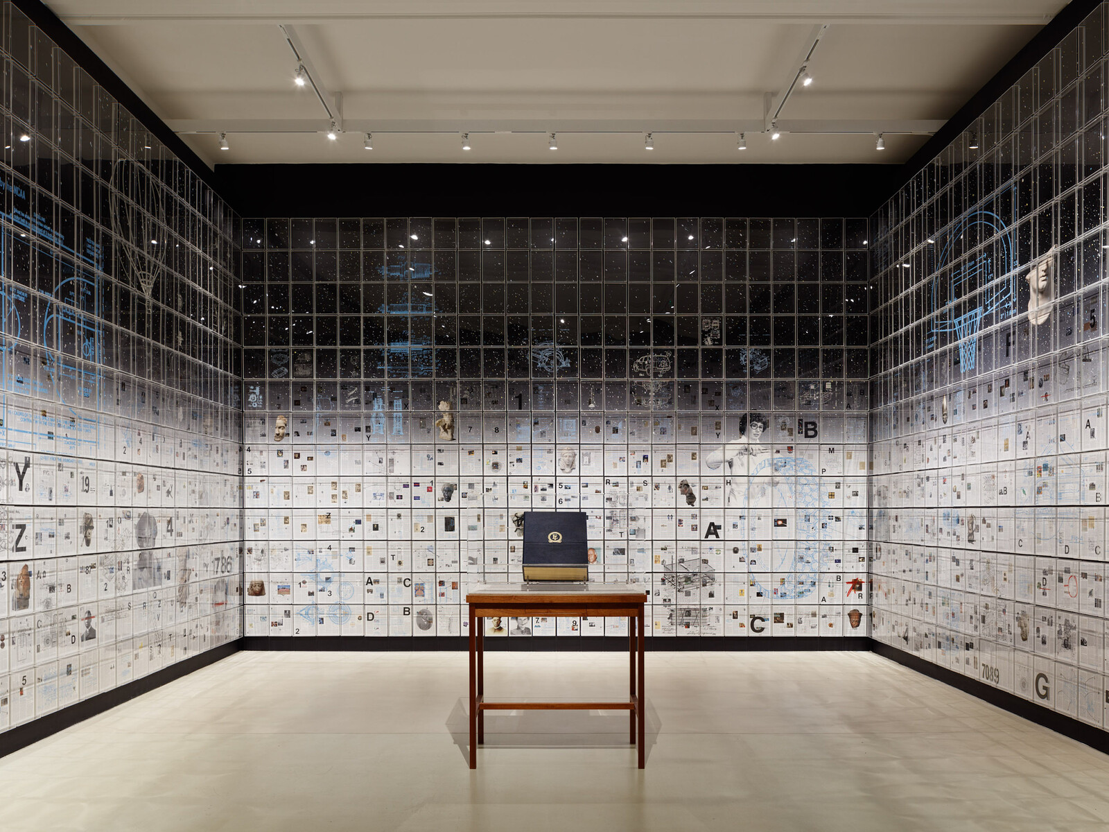 Strachan’s Encyclopedia is surrounded by 1,354 panels, titled EIGHTEEN NINETY (2020), made in UV ink, vinyl, oil stick, and collage. Each panel, about the size of an A4 page, is encased in a clear box and includes a page from Strachan’s encyclopedia, superimposed with collaged images of classical sculptures, handwriting, scientific diagrams, and other symbols. Further up, the printed text and writing fade into an image of a galaxy encasing the top of the walls. The Enlightenment idea of the encyclopedia as a neutral, inclusive repository of the knowledge of man is rejected on all levels here: by adopting the form while revising and annotating the content, and finally allowing it to dissolve into an image. History is alive, this work suggests, its telling an active process of addition and consideration.