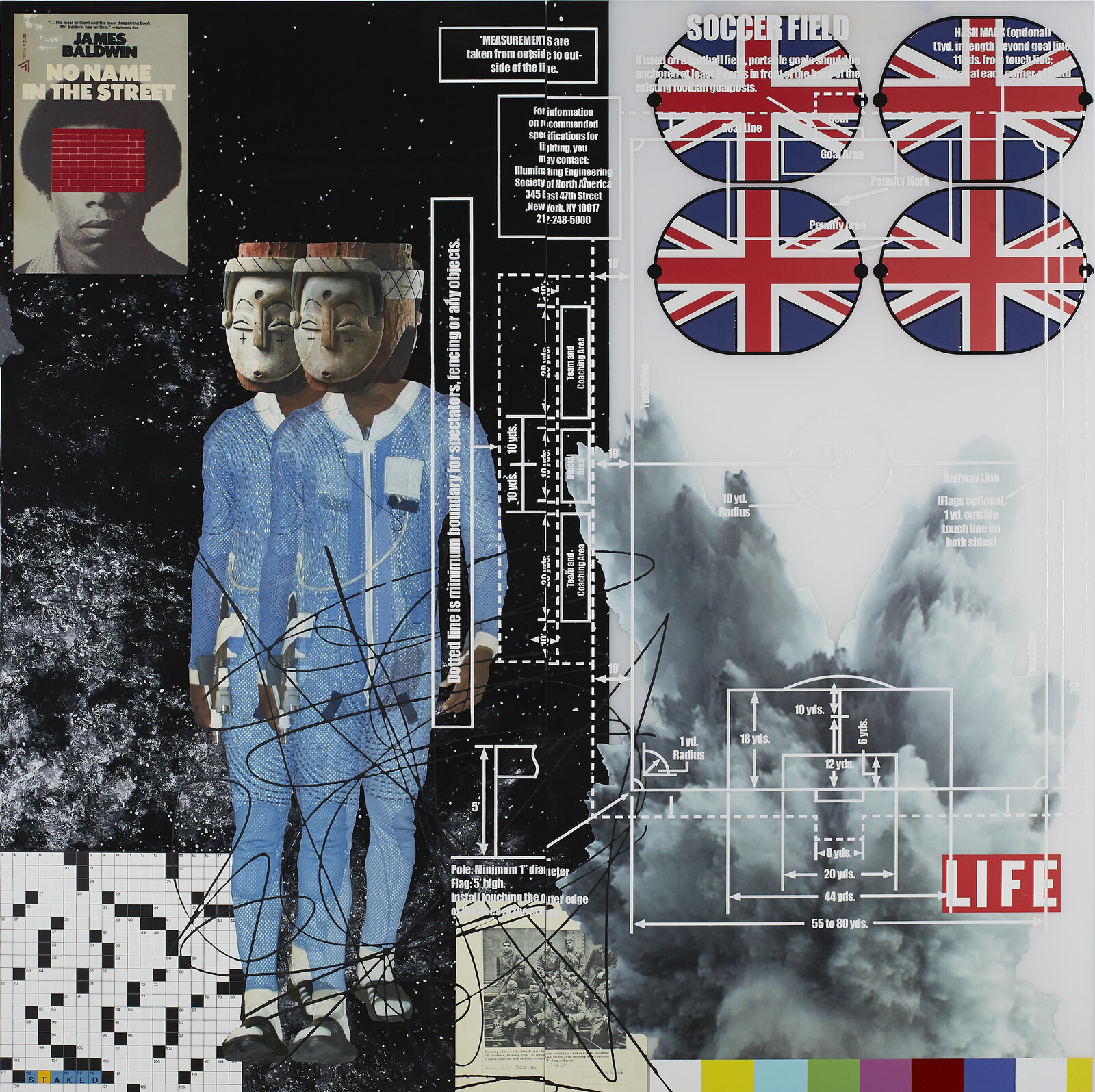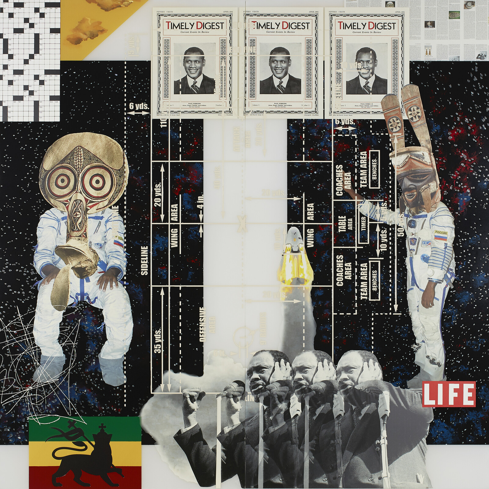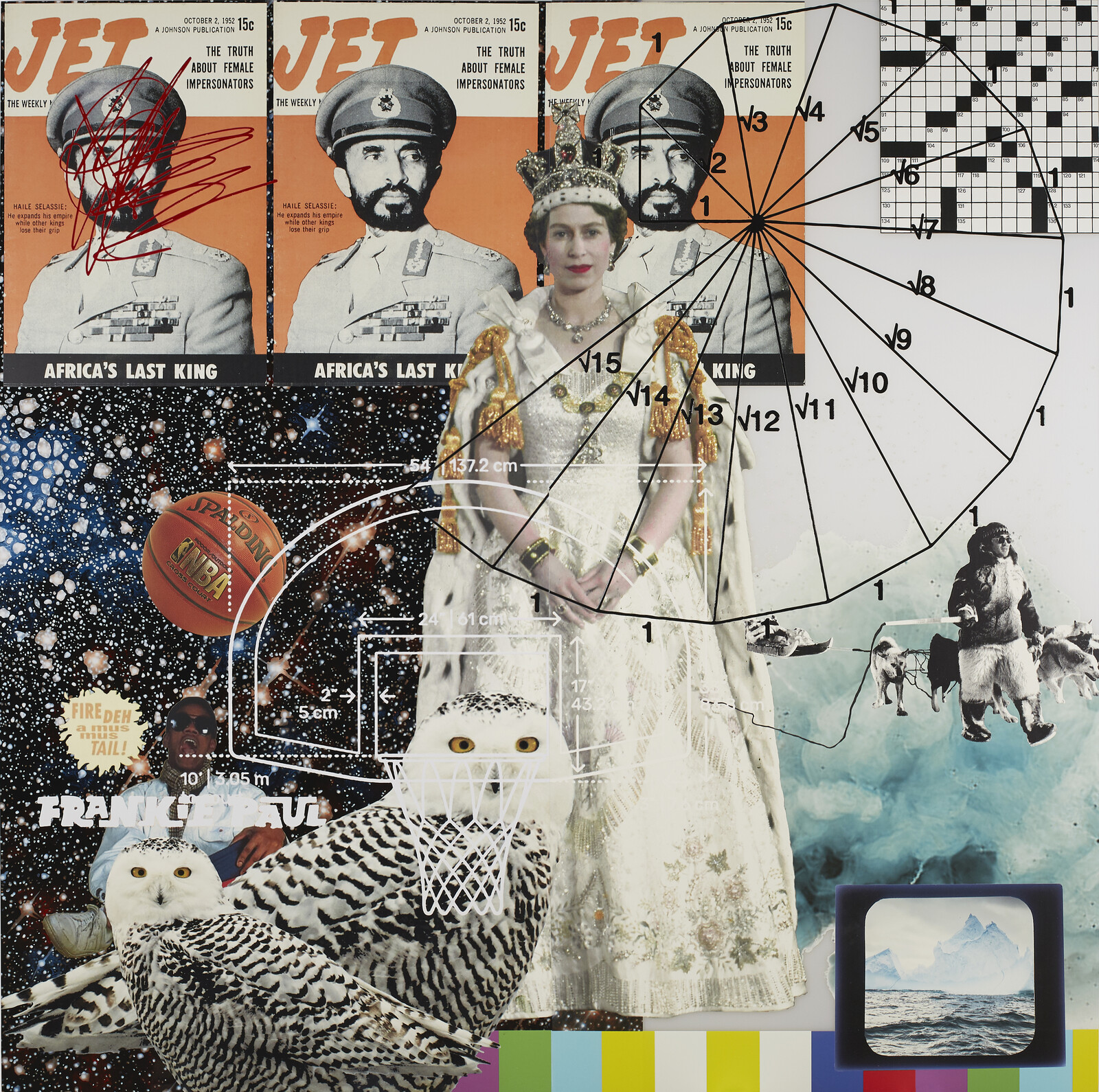 What is the relationship between the performance and the works on view? When I go downstairs the performers are gone, the rooms hidden behind the artworks lining the walls. It’s as if it never happened, and the display feels somewhat conventional. The main gallery includes eight of Strachan’s signature mixed-media on panel works, like huge history paintings that bring together imagery from Life magazine covers, reproductions of artworks, photos from the news, and so on. Every Knee Shall Bow (2020) includes a full-size photo from the coronation of Queen Elizabeth along with two owls, a small image of a television showing an arctic sea, and a photo of Ethiopian Emperor Haile Selassie on the cover of Jet magazine from 1952 over the headline “Africa’s Last King.”