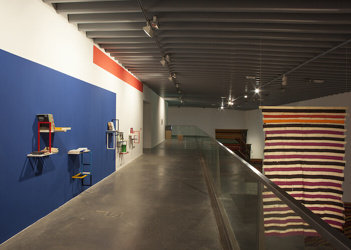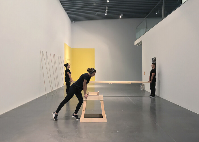 At the entrance are five striped tapestries and three sewn oil paintings made by Teresa Lanceta between 2003 and 2018. Hung from the double-height ceiling of the EACC, they generate a labyrinthine opening to the exhibition. Further inside the gallery, the white walls are partly painted in primary colors to indicate which works the public are invited to interact with. Luca Frei’s Simone Forti’s See-Saw (2015) and Sticks and Chains (2010) are perhaps the most playful of these. The latter consists of 13 wooden sticks measuring 240 centimeters each leaning against a yellow wall, joined at both ends by thin chains of the same length. Visitors are perhaps encouraged to play with their position (and disposition), carefully circling other works in the gallery or surrounding other gallery goers. First performed in December 1960 by Yvonne Rainer and Robert Morris, Forti’s See Saw was one of her “Dance Constructions”—her term for works she defined as both performances and sculptures, in which performers improvised gestures and formations according to given rules. At the opening of the EACC exhibition, Frei’s reactivation of Forti’s work began with performers carrying a plywood plank from one corner of the gallery to a wooden pivot located to the side. Once brought together, the sculptural elements formed a seesaw. Three performers from a local theater school variously climbed up and slid down the seesaw’s slanted surface, stood together at the center while trying to find balance, and briskly but carefully levered each other’s bodies. With its deceptively simple choreography of negotiation, Simone Forti’s See-Saw embraces and battles with gravity’s inevitable grip on the fate of the performers’ encounter and the pace of their relationship to the object. During the event, a young boy in the audience repeatedly asked his mother when the activity would finish. Once it was over, he exclaimed in relief: “Now it’s my turn!”