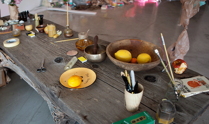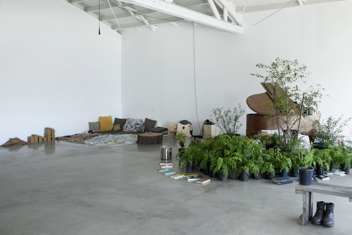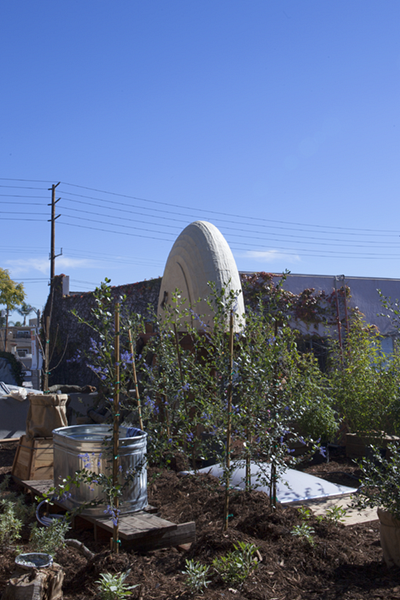 On the roof of Moran Bondaroff gallery in West Hollywood, Koh has built a beehive with a door big enough for humans to crawl inside. Above a mesh screen, teeming live bees build honeycomb between wooden slats. The hive—titled bee chapel (2017), the third he has made after a prototype in the Catskills and a version for his 2016 exhibition at Andrew Edlin Gallery, New York—stands on a rustic wooden platform perhaps six feet high, beside a temporary rooftop garden. Lavenders, sages, yarrow, fruit trees, leaf vegetables, and herbs grow in pots, surrounded by bark chippings. There is a compost toilet and a galvanized steel tub, which Koh fills with a hose and uses as his bath, because for the six-week duration of the exhibition, he is living in the gallery downstairs.