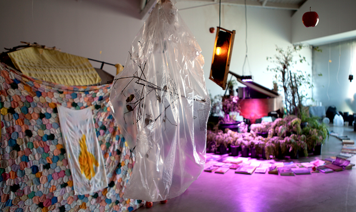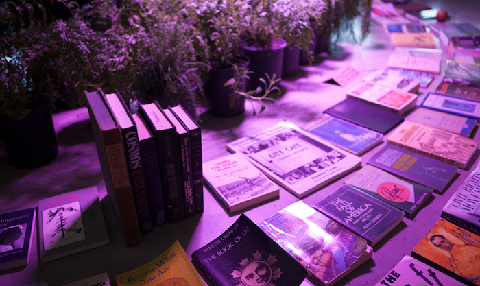 All around are plants, and books: books about beekeeping, books about self-sufficiency and environmentalism, books about comparative religion and meditation, books about cosmology, a fall 1970 edition of The Whole Earth Catalog, Henry David Thoreau’s Walden (1854), a book on Black Mountain College. Books are easy signifiers of intellectual context, even if they remain unread. When I asked Koh why Ayn Rand’s Anthem (1938) featured so prominently in the show (not only in bound form but also used as a sculptural and culinary material, its pages dipped in honey and baked to a crisp, apparently meant for snacking), he simply said he had heard that the Republicans were reading Rand. And that he chose that novel because of its last line: “The sacred word: EGO.”