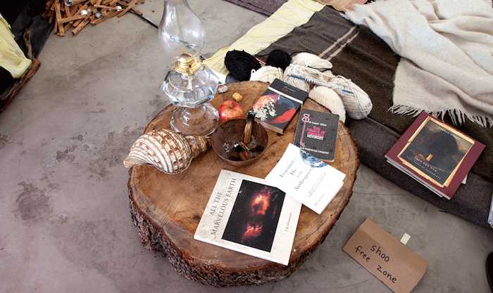 The gallery itself smells strongly of incense and beeswax, and Tibetan bells jangle on the door. In one corner, a mattress has a patchwork blanket thrown over it, and pegs display Koh’s denim-heavy wardrobe. (He no longer dresses exclusively in white.) In another corner, a sitting area has cushions scattered about, and a couple of low tables made from tree trunks. A baby grand piano stands surrounded by potted plants, with a cooking pot placed on the strings beneath its lid; unlike the bed and the tables, this assemblage is a work titled the whole earth (2017). On the music stand—ironically? unironically?—rests a book by Joseph Campbell called The Power of Myth (1989).