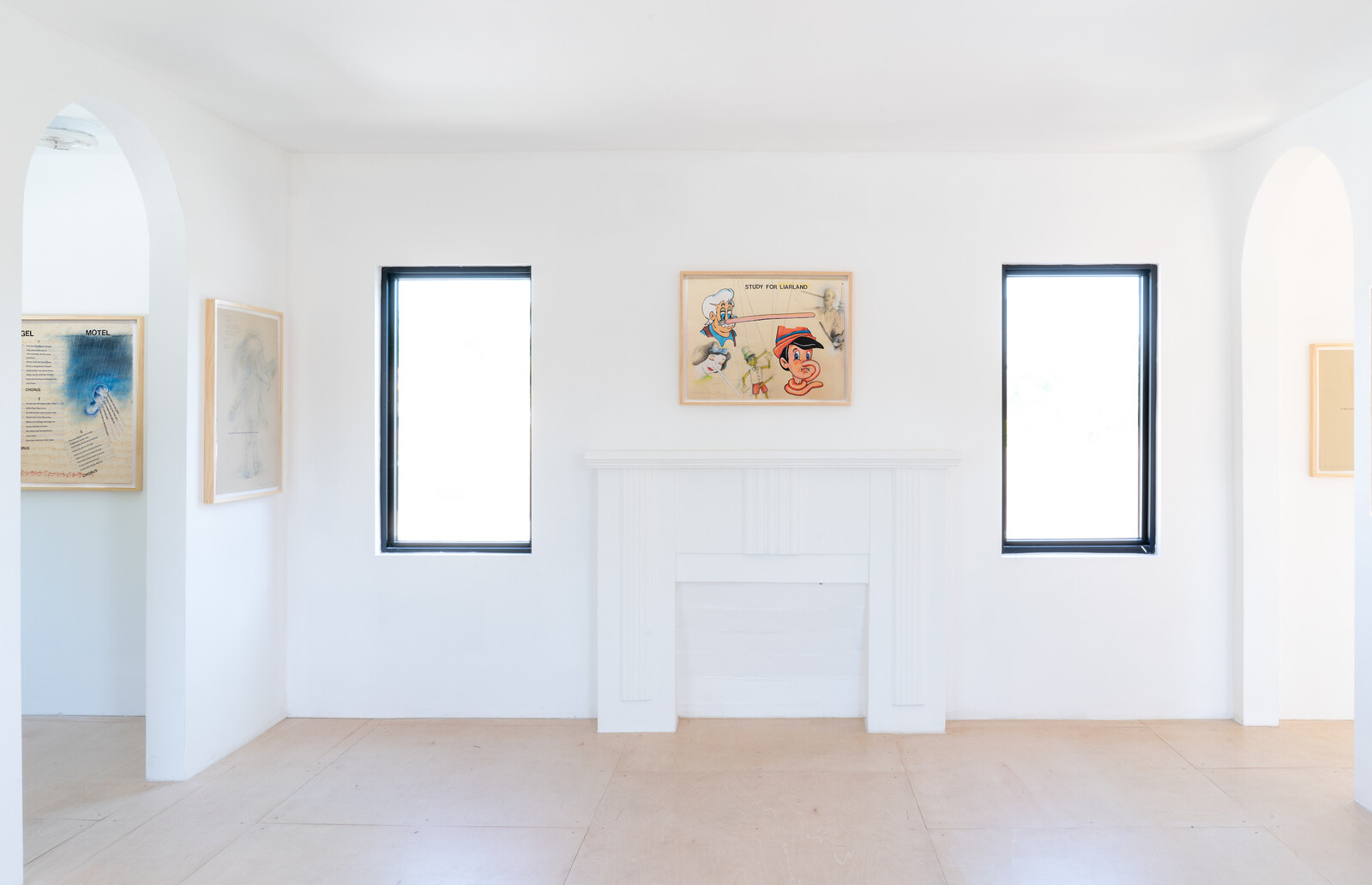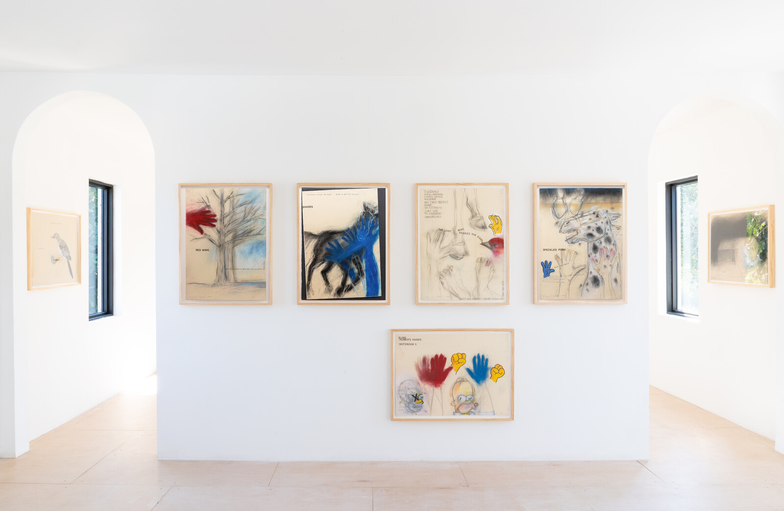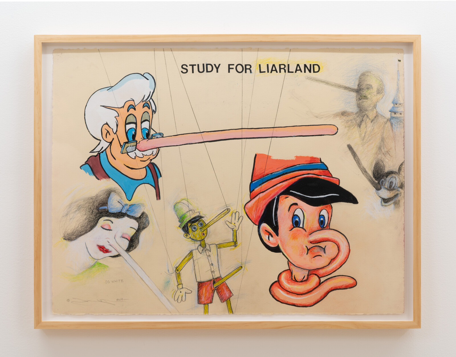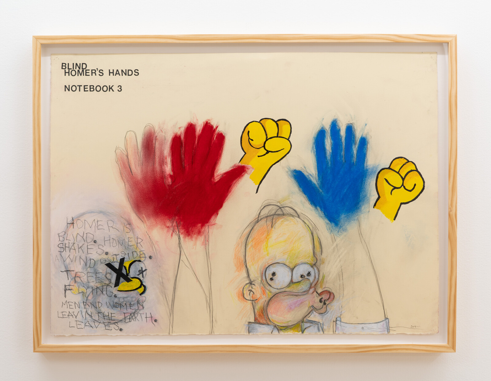 Tragedy and comedy are guiding points on Allen’s aesthetic compass. In Study for LIARLAND, a group of Disney characters suffer from Pinocchio’s moral-physical pathology: Mickey Mouse, Snow White (labeled “So White”), The Adventures of Pinocchio (1883) author Carlo Collodi, and Walt Disney all have the long noses of a liar. Indicating Allen’s occasional tendency to push into cloying, obvious territory, puppet Pinocchio has a raging, erect nose shooting out the fly of his pants, while human Pinocchio gets strangled by his own schnoz. Exaggerating cartoon tropes to critique American power is a tired strategy—but a picture with a psychedelically superimposed Homer Simpson, Blind Homer’s Hands/Notebook 3, is compelling: a figure of buffoonery that you love to hate.