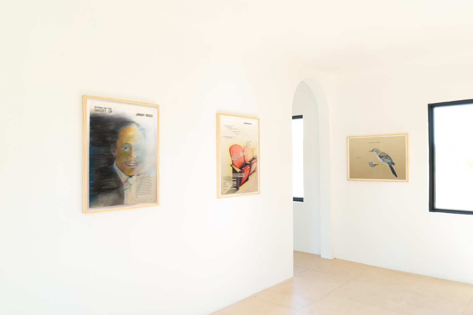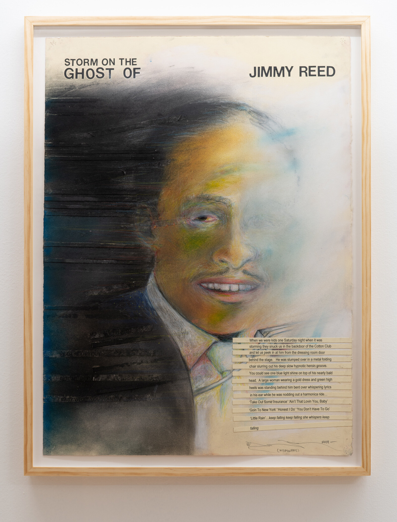 “Terry Allen: Some Pictures and Other Songs,” at Nina Johnson, consists entirely of drawings, all from 2019. In Storm on the Ghost of Jimmy Reed, Allen presents the bluesman Reed with a mustachioed, half-faded face. A text in the bottom-right of the drawing reads: “When we were kids one Saturday night when it was storming they snuck us in the backdoor of the Cotton Club and let us peek in at him from the dressing room door behind the stage. He was slumped over in a metal folding chair slurring out his deep slow hypnotic heroin groove. You could see one blue light shine on top of his nearly bald head. A large woman wearing a gold dress and green high heels was standing behind him bent over whispering lyrics in his ear while he was nodding out a harmonica ride.” From Allen’s ongoing “Memwars” series, it’s a colorful yarn braiding music history and personal memory. The cheeky portmanteau memwar reflects Allen’s way of lamenting wars foreign, domestic, and class-based. He doses his art with enough bittersweet humor to highlight the absurdity of conflict—and maybe make it a little easier to think about.