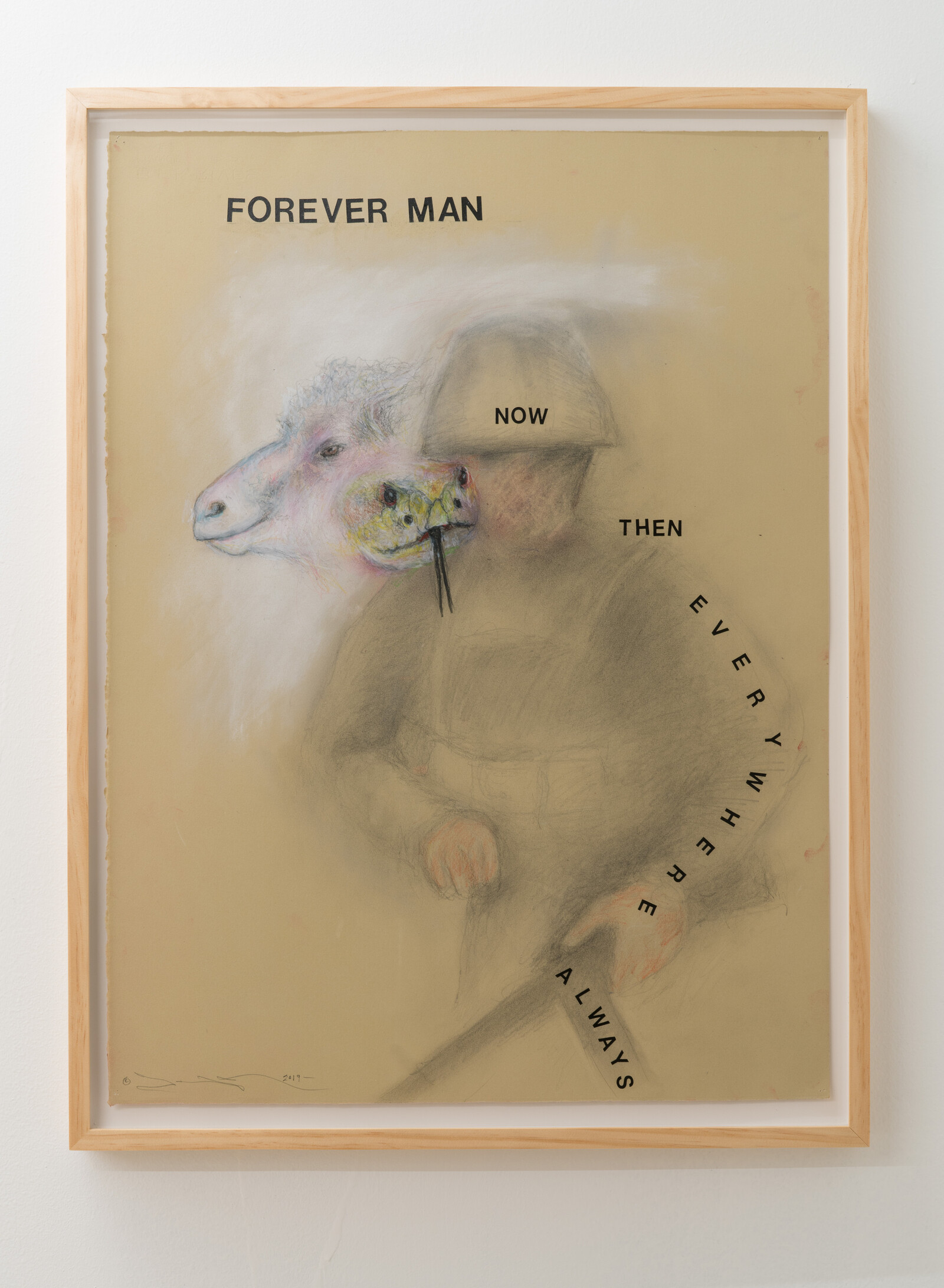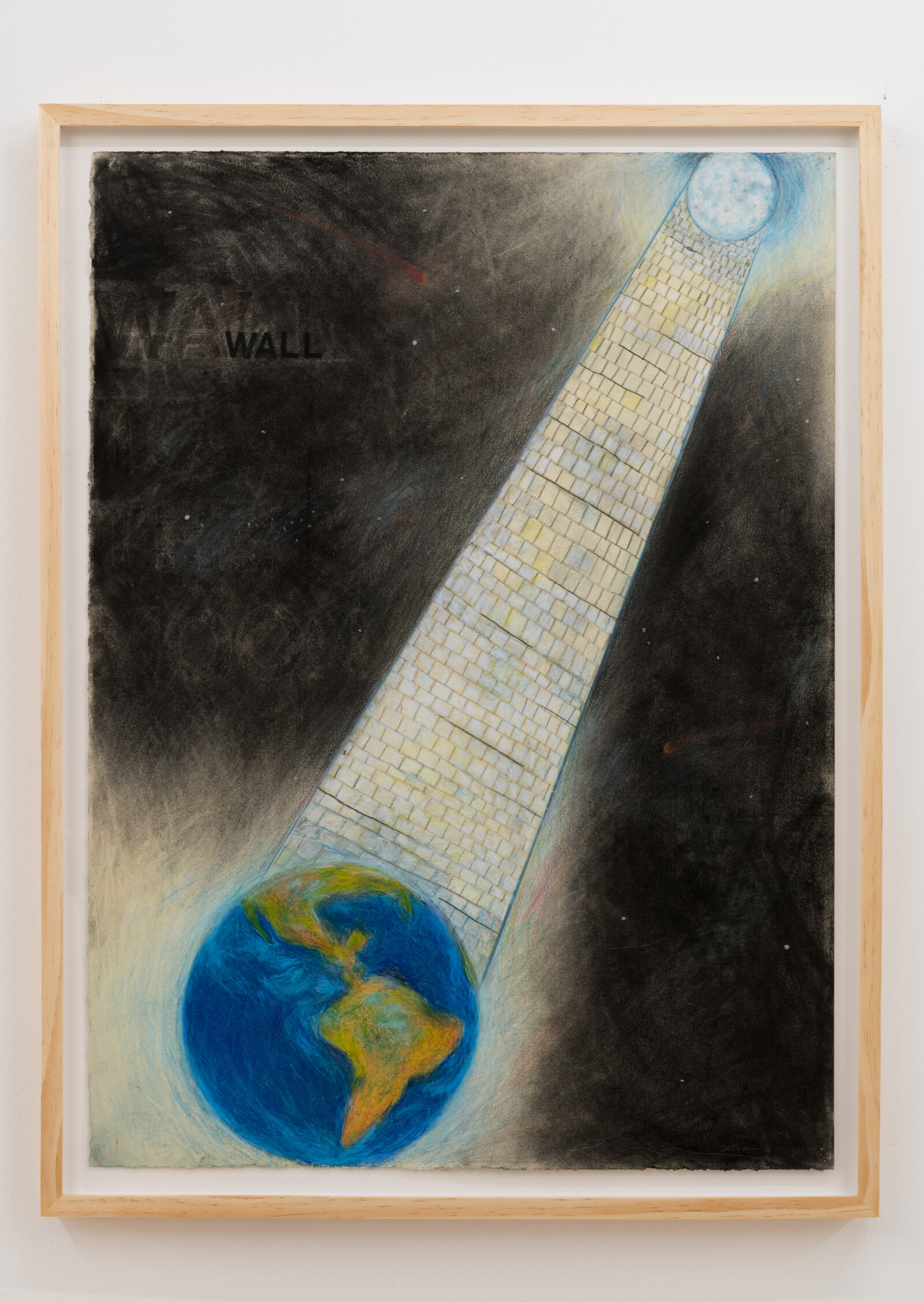 Allen’s work is better when it winks, rather than smirks. In Wall, Earth and the moon are separated by a brick wall. Rather than militarized separation and restrictions on freedom—there is no doubt that Allen is anti-wall—the first impression is of a tower connecting the two. Such comedic torquing can enter corny or cliché territory, but it’s at its finest in works like Duet: a portrait of Lassie and the Marquis de Sade, the innocent heroic and the pornographic criminal side by side. Characters in time and place, the use of storytelling to flesh out our complex selves—these are what makes Allen’s work so resonant. His creative universe, reflecting our own, is a litany of junkies and cops, quadruple amputees and peyote eaters, lovers and killers. The show functions best as an invitation into his world, rather than as a mirror to topical issues. After all, it’s just the same fucking war.