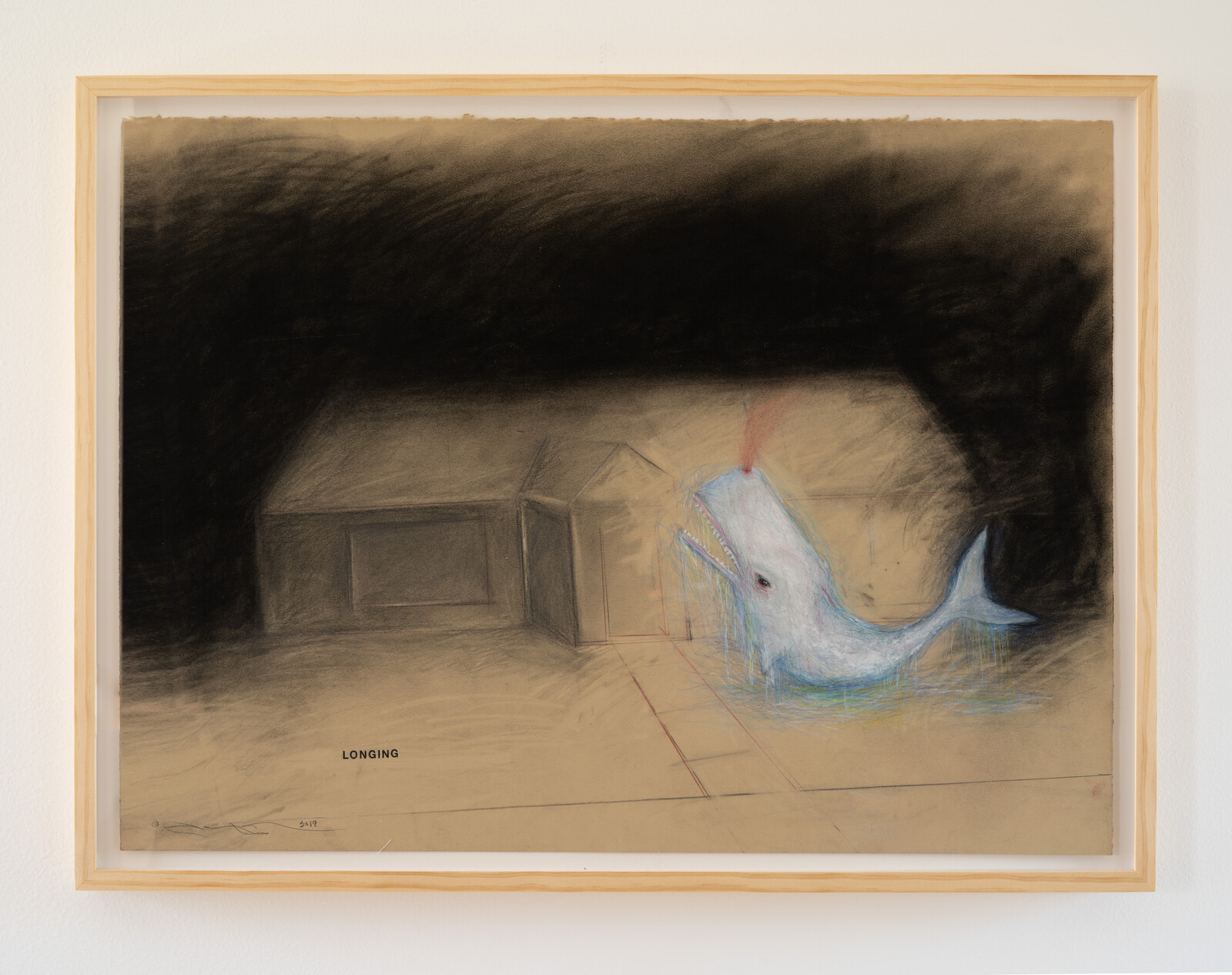 In Forever Man, a blurred image of a soldier contains the words: “NOW,” “THEN,” “EVERYWHERE,” and “ALWAYS.” Resting above his right shoulder is a snake with its forked tongue out and a donkey with a naughty look on its face. The Vietnam War, at full tilt once Allen’s career began, was his fulcrum. His body of work titled “Youth in Asia” (1983-1991) dealt with the war’s aftermath, in part a memorial to those soldiers who committed suicide. These days, Allen seems to view war not as a discrete series of conflicts but as a cohesive, eternal machine. As he laments on his newest record, Just Like Moby Dick (2020), “It’s just the war, same fucking war, it’s always been.” Memoir, in Allen’s phrasing, is a form of war, a never-ending conflict between nostalgia and trauma. In Longing, a white sperm whale (presumably Moby Dick) lies beached, spraying blood from its blowhole, on the front lawn of a house against a black background that threatens to engulf it.