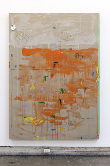 At Susanne Vielmetter, Los Angeles, Pope.L’s rough and ready Black Letter Painting (2017) evokes at once the feelings of lasting endurance and almost ghostly ephemerality through a dimly stenciled palimpsest of letters and words (beginning with those of “Brown People” near the top of the canvas) underneath provisional daubs and smears of thin paint, augmented by blue painters’ tape and a lone post-it note seemingly barely held in place, as if an afterthought waiting to be finished.