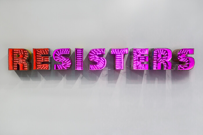 The large cutout lettering of Andrea Bowers’s Resisters (2017) at Kaufmann Repetto, Milan, is made of cardboard and tiny LED lights networked in series. Through different colors flashing across the letters a double-meaning (“Re” + “sisters”) is continually highlighted. The effect from a near distance is half elegant, half gaudy. Coming closer to the piece, that effect is belied by the cheap material of cardboard from recycled commercial product packaging and the exposed wiring for the lights inside the letters. Insistent, beguiling, the piece has it both ways: as pointer to continue the struggle even where simple gestures of solidarity can feel enervated, persisting in not keeping still and not shutting up.