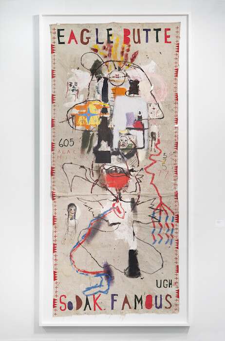 At Jack Shainman Gallery, New York, Brad Kahlhamer’s Eagle Butte SoDAK Famous (2016) channels a complex iconography of Native American archetypes and clichés through the painterly gestures of late-last-century East Village New York, employing oil on a painters’ tarp in sketchy yet effective fashion.