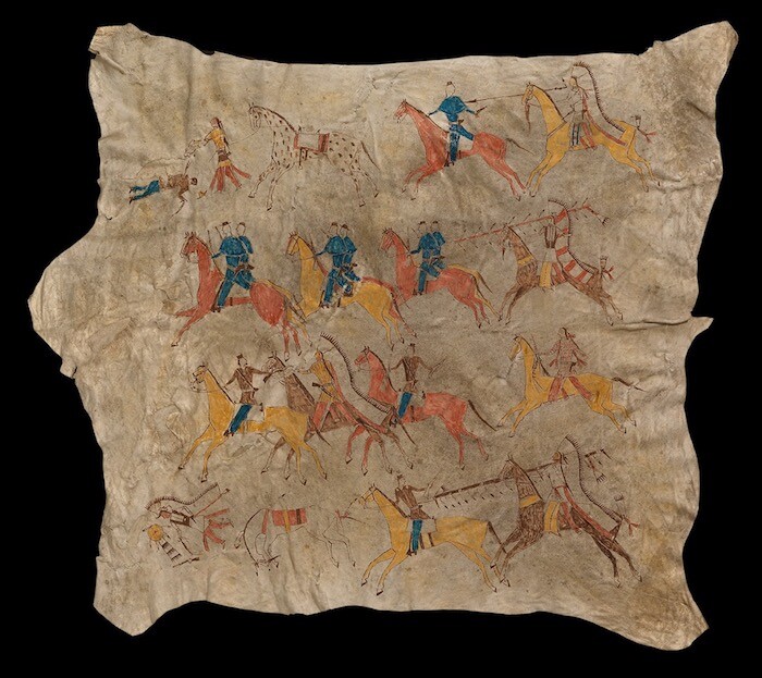 The gestures of the Native American Cheyenne River Tribe are shown by Donald Ellis in fuller force with a series of ledger drawings and two larger paintings on animal hide that form the oldest ensemble of work at the fair, dating back to the 1850s. The imagery transmitted in many of these pieces, collected and traded from indigenous peoples, documents the shifting of indigenous culture under colonialism for future generations and other peoples—via depictions, for instance, of early, hostile encounters between Native Americans and U.S. military, or in the very medium of the drawings themselves: accounting ledger books introduced by U.S. government agents starting in the middle of the nineteenth century and used by indigenous artists as a new material resource. Such an unintended outcome is all the more potent and poignant at the moment that a series of confrontations at Standing Rock over land rights and the threat of environmental degradation in the Dakotas has brought issues relating to the U.S. government’s disregarded treaties for native land back to public attention, but then was superseded yet again by onslaughts of bad-faith politics and rapid-fire modern media news cycles.